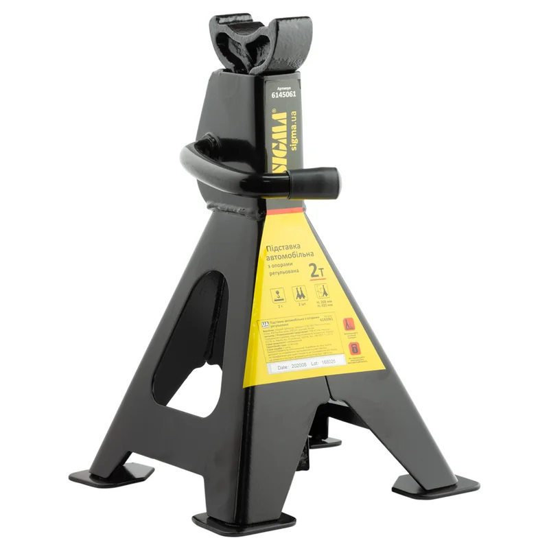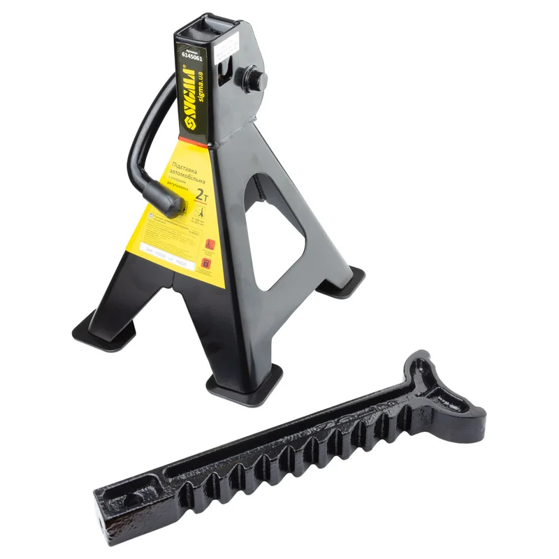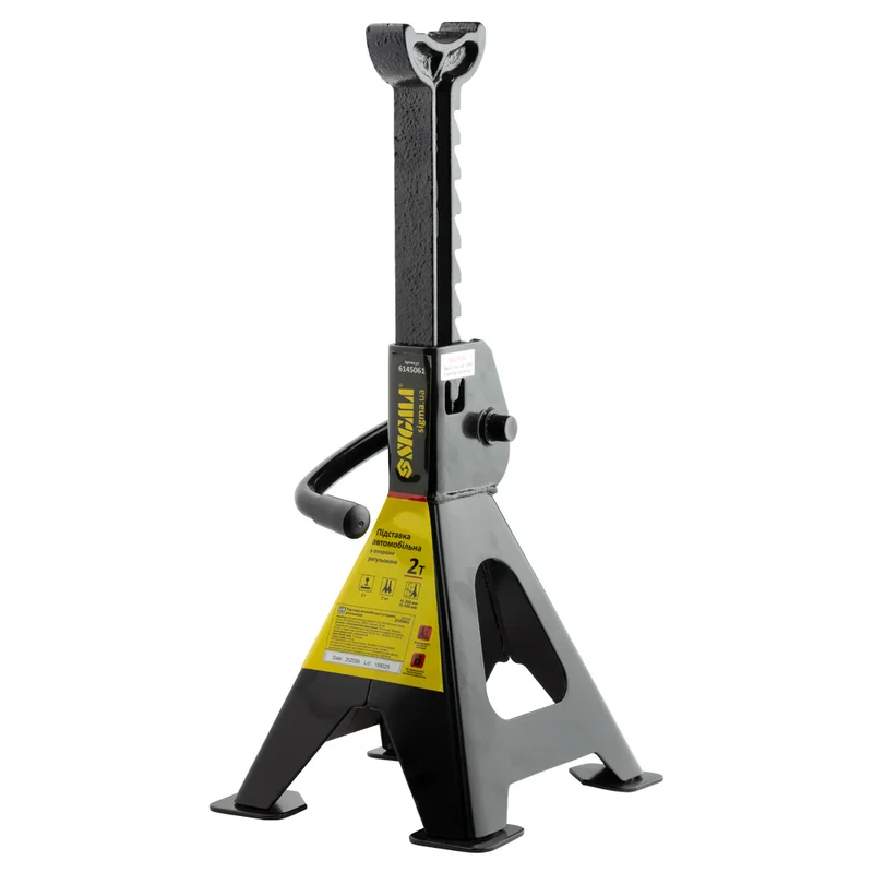 Підставка автомобільна з опорами регульована 2т (2шт) SIGMA (6145061) - професійний засіб надійної фіксації і страховки при підйомі автомобіля для проведення огляду та ремонтних робіт. Рекомендується використовувати з усіма типами домкратів. Потужна рама з цільного сталевого листа з мінімумом зварних швів - гарантує безпеку робіт. Універсальний діапазон висот фіксації (від 278мм до 420мм) дозволяє обслуговувати автомобілі з різним кліренсом. Збільшені опори ніжок забезпечують надійну (без перекосів) фіксацію підставки на поверхні і захищають від пошкоджень покриття для підлоги в гаражах і автосервісах.