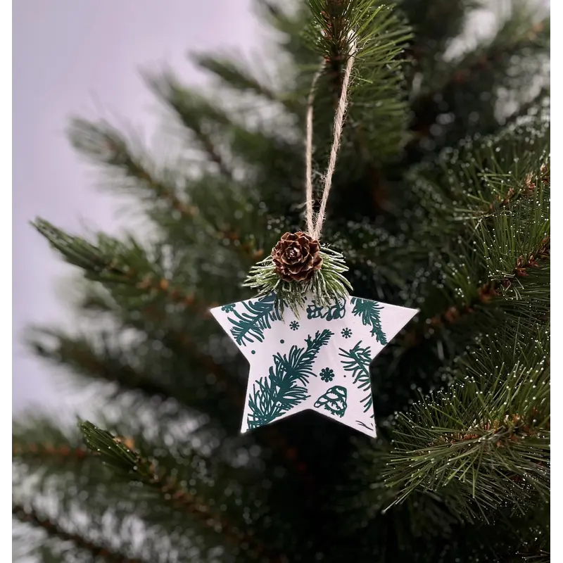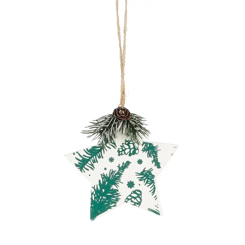Декоративна підвіска House of Seasons у формі зірки стане стильним доповненням новорічного оздоблення. Виріб виконаний з міцного МДФ, пофарбованого в білий колір і прикрашеного зеленим малюнком хвойних гілок і зимових мотивів. Діаметр прикраси становить 9 см при товщині 8 мм, що робить її помітною, але не перевантажує загальну композицію. Додатковий акцент надає мініатюрна шишка зі штучною хвоєю у верхній частині, а зручна петелька з джутової нитки дозволяє легко підвісити декор на ялинку, вінок або гірлянду.Особливості Форма зірки і натуральні матеріали створюють атмосферу затишку і підкреслюють зимову тематику святкового інтер'єру. Білий фон із зеленим малюнком хвойних гілок надає виробу виразності і гармонійно поєднується з класичним новорічним декором. Мініатюрна шишка зі штучною хвоєю додає об'єму і декоративності, роблячи підвіску більш оригінальною. Виготовлення з МДФ забезпечує міцність і довговічність прикраси при багаторазовому використанні. Зручна петелька з джутової нитки дозволяє легко розмістити підвіску на ялинці або інших елементах декору.Варіанти використання Підходить для прикраси новорічної ялинки, створюючи затишні і стильні акценти. Ефектно виглядає на святкових вінках, гірляндах і настінних панно. Може використовуватися як елемент декору для упаковки подарунків, додаючи їм оригінальність і завершений вигляд. Прекрасний вибір для оформлення фотозон або інтер'єру в скандинавському стилі, де цінується натуральність і лаконічність.*Реальний колір товару може дещо відрізнятися від зразків, представлених на сайті, в залежності від технічних налаштувань Вашого екрану, а також, з огляду на особливості матеріалу, відтінок товару може змінюватися в залежності від освітлення.