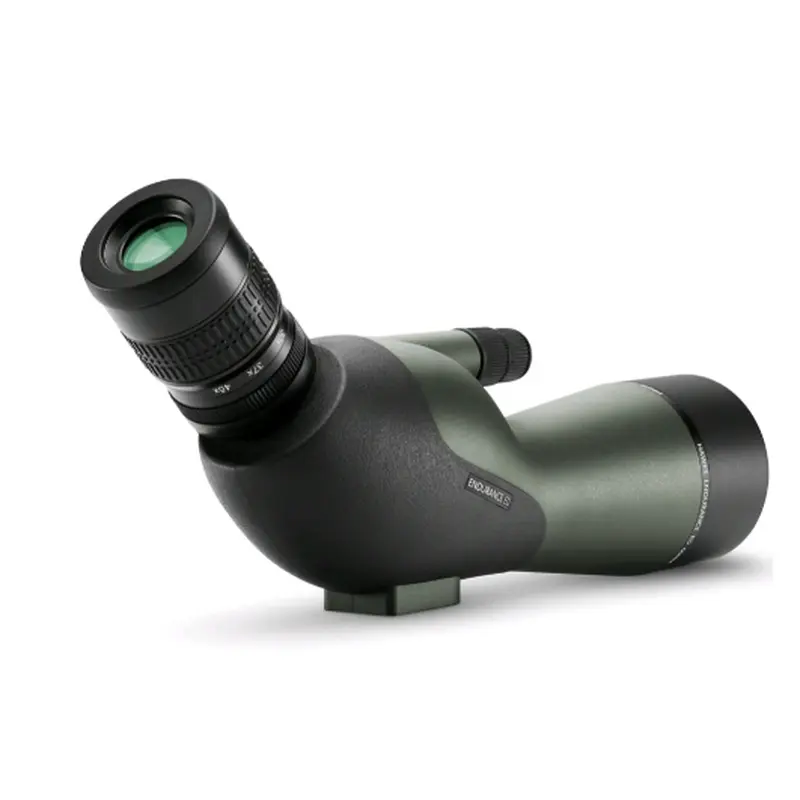 Окулярний вузол Hawke Endurance ED розташований під кутом 45º по відношенню до поздовжньої осі труби - це дуже зручно для спостережень в положенні лежачи і з настільних штативів. Корпус повертається навколо осі, встановлюється під будь-яким кутом і фіксується в кільці з роз'ємом для кріплення штатива. З цікавих рішень можна відзначити чіткі фіксовані положення труби при повороті навколо осі в точках 0º, 45º і 90º. Висувна Сонцезахисна бленда захищає об'єктив і від сонячних відблисків і від опадів. На захисній бленді знаходиться спеціальний цілик для попереднього наведення труби на ціль. Монтажна база труби адаптована під стандартне кріплення фотоштатива, так що пошук необхідної опори для спостереження - не проблема.