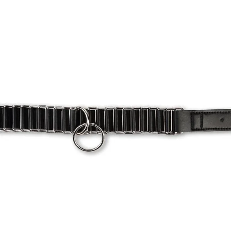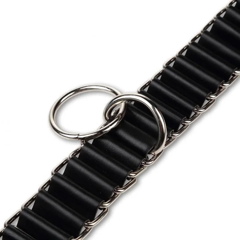 Ошейник изготовлен из прочной эко-кожи, протянутой сквозь крупнe. металлическую цепь, к кольцу, на передней стороне ошейника можно, при желании, пристегнуть любой БДСМ девайс, от поводка до бондажных элементов.