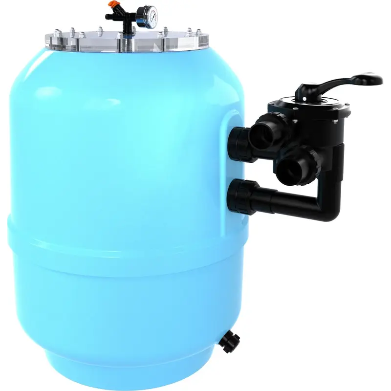 Боковий пісочний фільтр для басейну Emaux GAC600 призначений для механічного очищення води в приватних басейнах та SPA об'ємом до 70 000 л. Корпус виготовлений із полімеру, посиленого скловолокном. Фінішне просочення корпусу забезпечує захист від вологи та УФ. У комплекті: боковий 6-режимний кран, муфти, манометр.