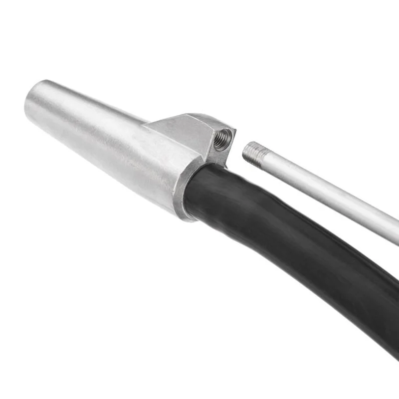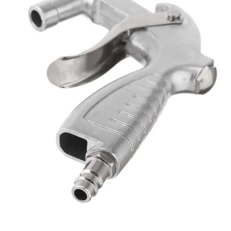 Піскоструминний пістолет має надійну та практичну конструкцію з хромованого металу зі шлангом для абразиву в комплекті. Варто зазначити, що найкраще у ролі абразива використовувати промитий кварцовий пісок або спеціальну абразивну суміш: електрокорунд, купершлак, дріб зі сталі або чавуну та ін.