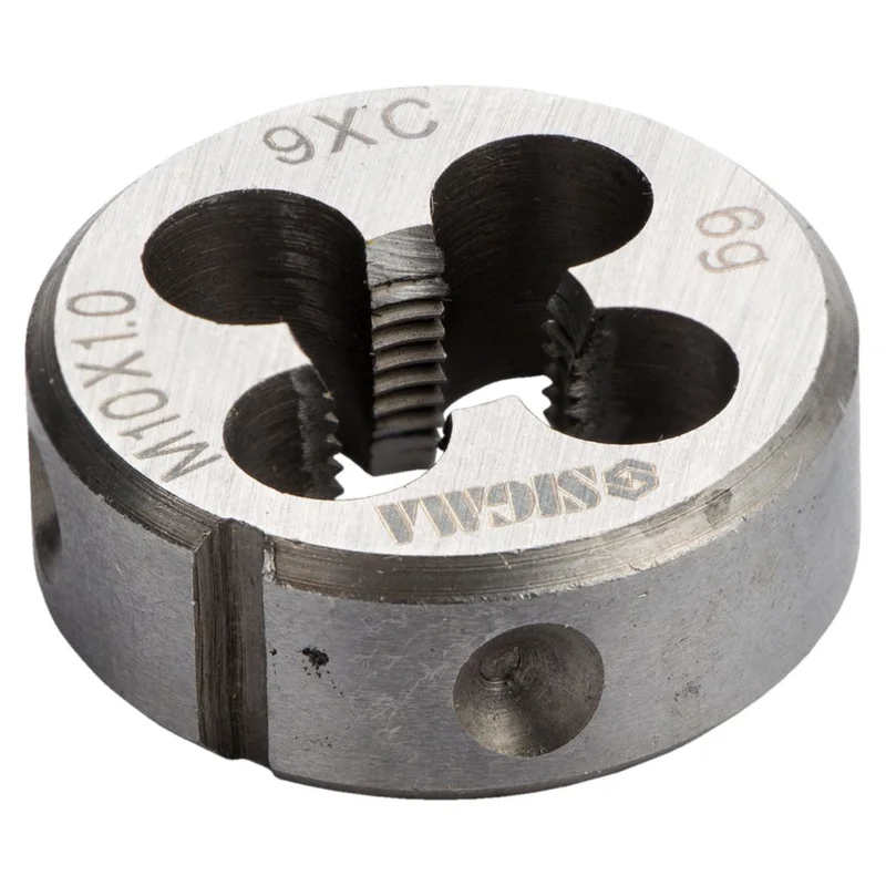 Плашка М10×1.0мм SIGMA (1604261) призначена для нарізування або калібрування зовнішніх різьб. Для роботи закріплюються в тримачах для плашок зі стопорними гвинтами. Для фіксації на зовнішньому циліндрі плашки існують конічні поглиблення і кутовий паз. При нарізанні, різьблення, попередньо, змащують консистентним мастилом.