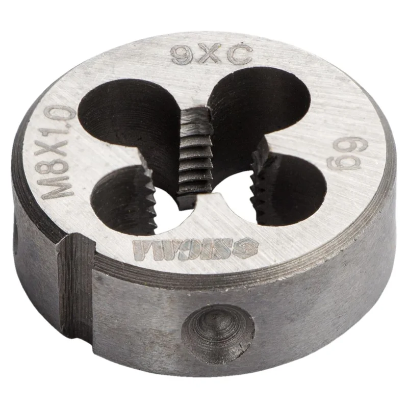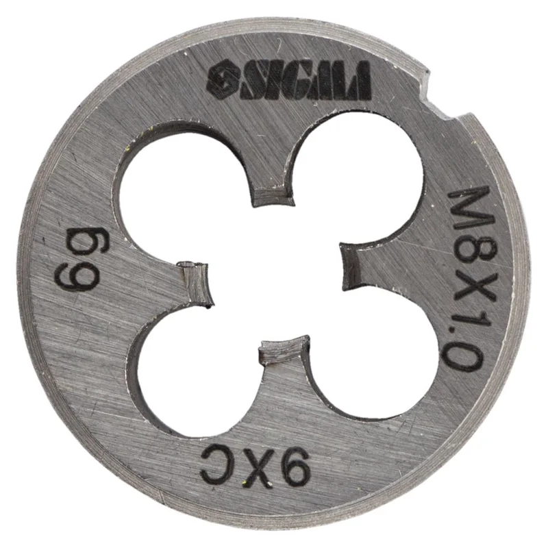 Плашка М8×1.0мм SIGMA (1604201) призначена для нарізування або калібрування зовнішніх різьб. Для роботи закріплюються в тримачах для плашок зі стопорними гвинтами. Для фіксації на зовнішньому циліндрі плашки існують конічні поглиблення і кутовий паз. При нарізанні, різьблення, попередньо, змащують консистентним мастилом.