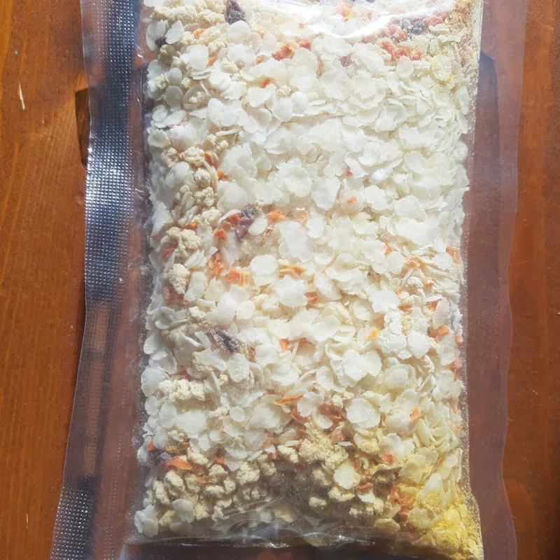 Особливість: для приготування використовуються тільки натуральні компонети, ніяких підсилювачів смаку або барвників, блюдо приготовлено шляхом сушіння з готових продуктів.