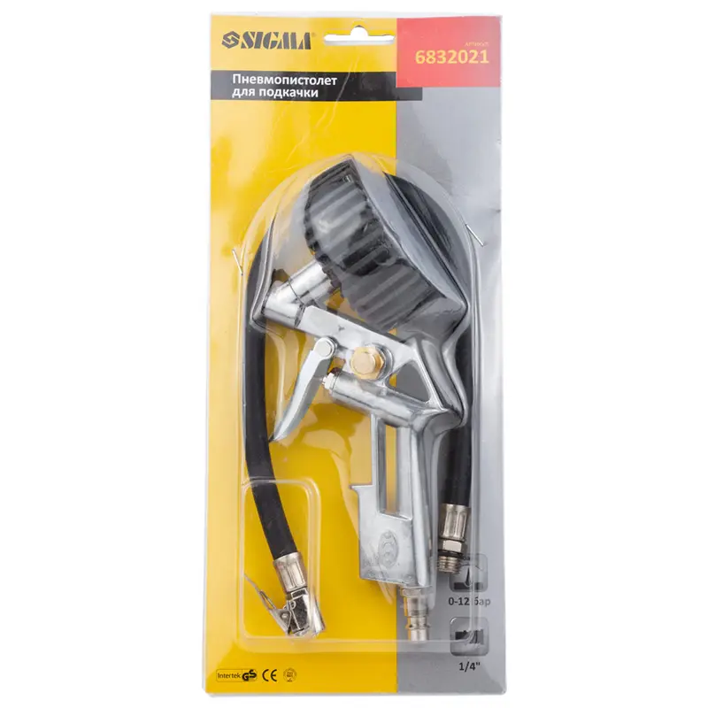 Пневмопістолет для підкачки (гальван покриття) SIGMA (6832021) з гальванізованим покриттям застосовується для підкачки шин автомобілів. Зручний гнучкий шланг дозволяє виконувати операції в важкодоступних місцях.
