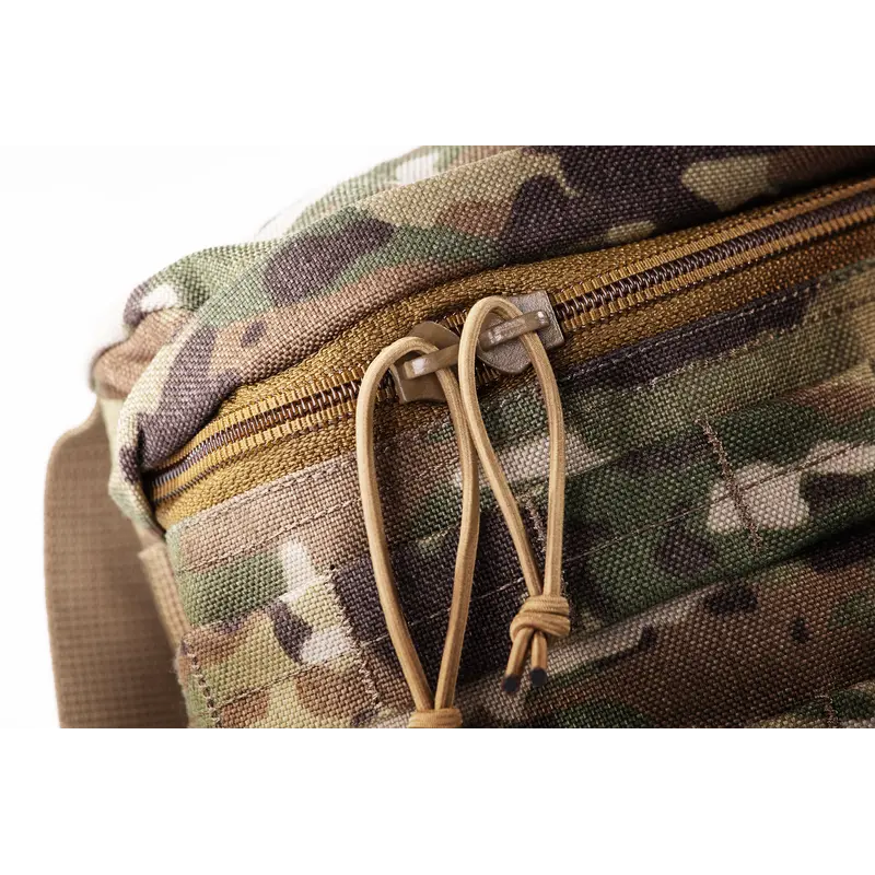 Крышка подсумка закрывается на молнию с двумя бегунками, что делает доступ к содержимому подсумка легким и быстрым.