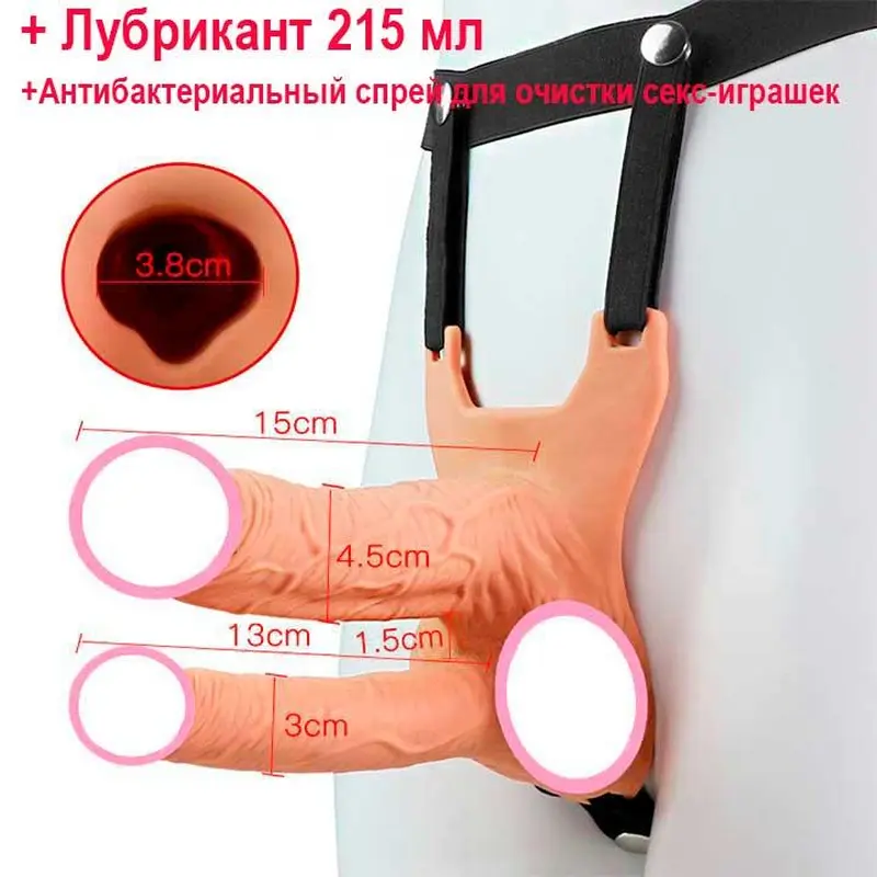 Подвійний порожнистий страпон з вібрацією 10 режимів + Лубрикант 215 мл + Спрей для очищення секс-іграшок Тілесний
