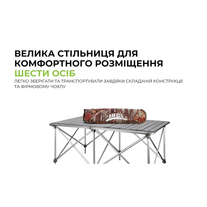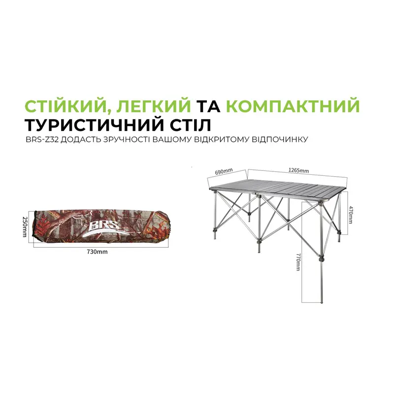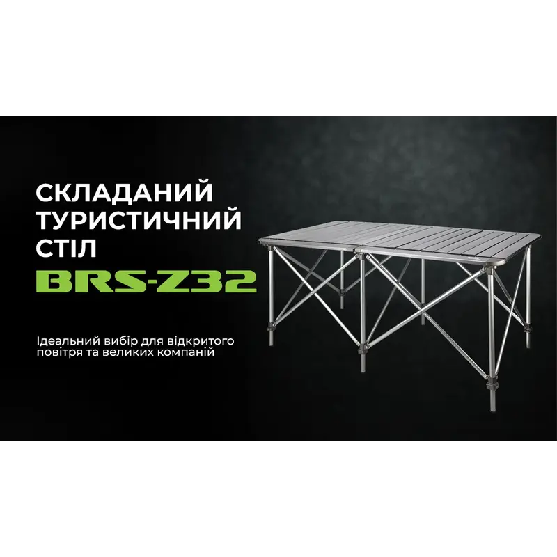 Стіл BRS-Z32 призначений для використання на відкритому повітрі та дозволяє з комфортом облаштувати місце для приймання їжі на численну групу людей. Модель складається з двох частин: каркасу та стільниці. Обидві мають складану конструкцію та виготовлені з легкого алюмінієвого сплаву, що не піддається іржавінню та витримує інтенсивні механічні навантаження, включаючи падіння з висоти та вплив людської ваги.