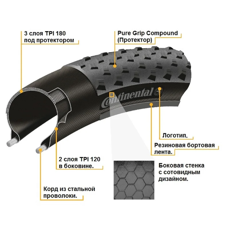 • Новая резиновая смесь «Pure Grip» («Чистый Захват»), расположилась в линейке технологий Continental сразу за смесью BlackChili и используется в шинах как для шоссейных, так и для горных велосипедов.