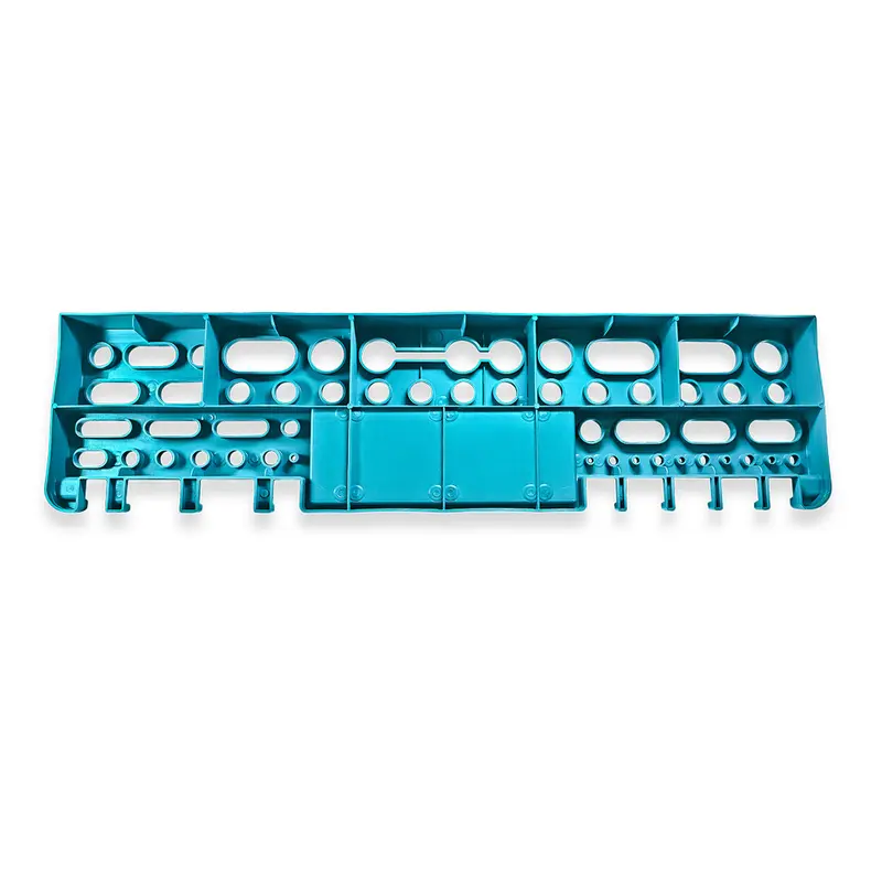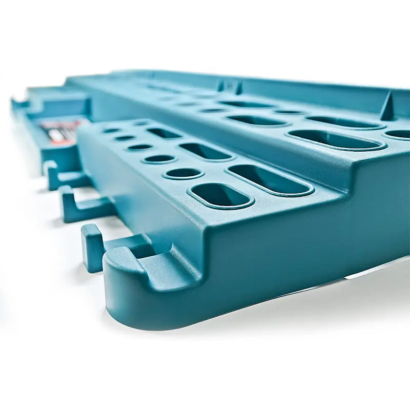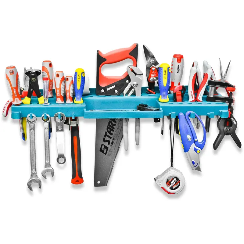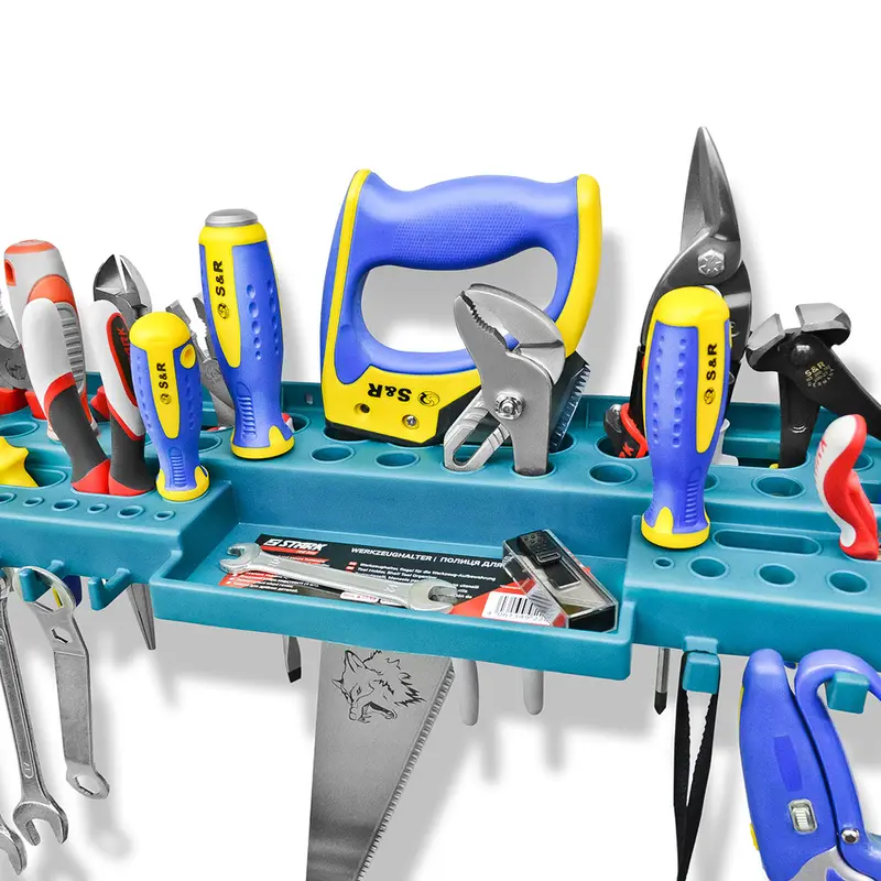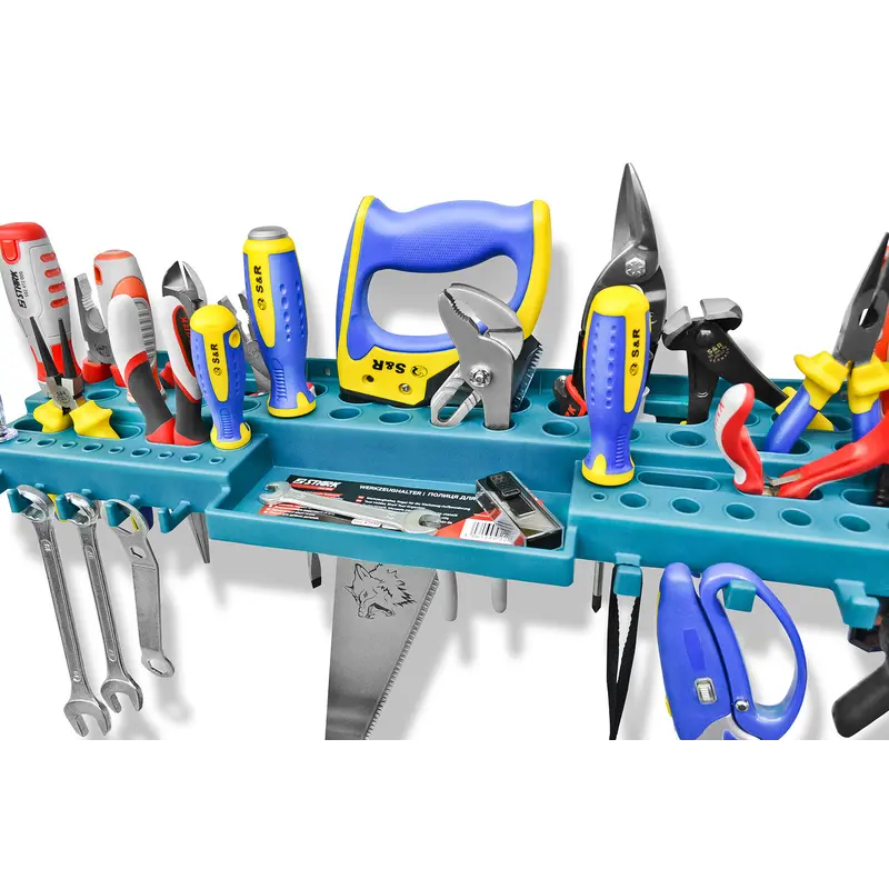 Надійна конструкція завдяки посиленим кріпленням; Міцна конструкція полиці дозволяє компактно розмістити весь необхідний інструмент поруч з робочим місцем і значно заощадити робочий простір. Надійне кріплення на стіну і наявність шести ребер жорсткості витримує повне завантаження всіх осередків полки і забезпечує відсутність провисань. Для дрібних деталей передбачений лоток. 6 ребер жорсткості забезпечують відсутність провисань; Велика кількість кріплень і отворів для розміщення різноманітного інструменту; Лоток для дрібних деталей