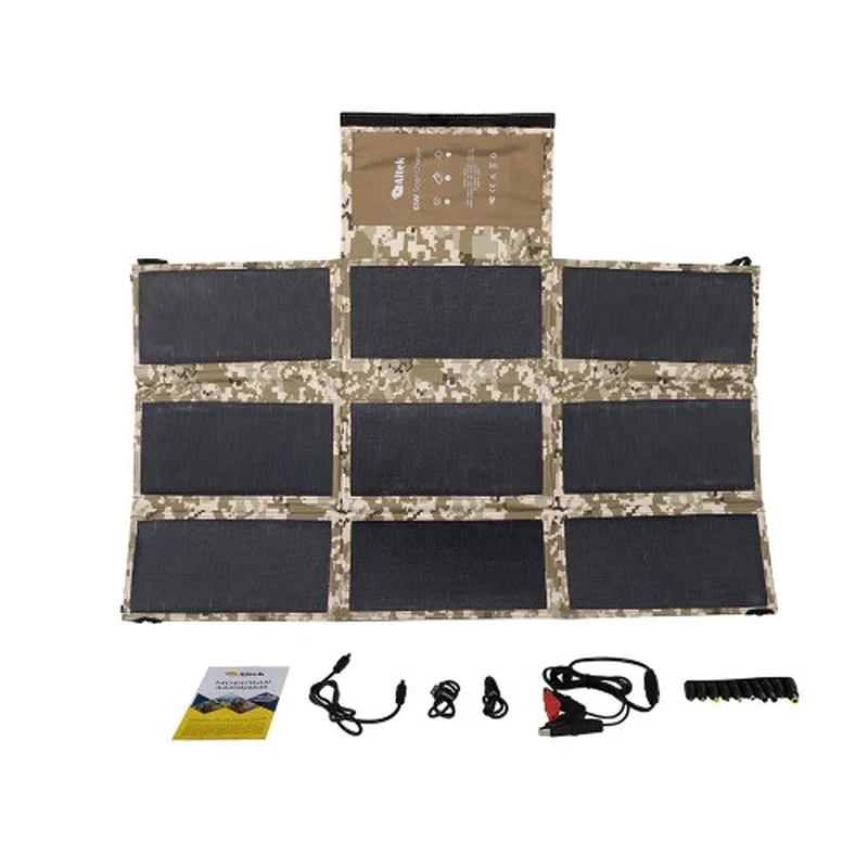 Монокристалічна сонячна панель ALTEK ALT-63, потужністю 63Вт з МРРТ контролером підходить для вирішення проблем енергопостачання слаботочного обладнання. Відмінно підходить для заряду мобільних пристроїв та павербанків, ноутбуків, камер, рацій, мобільних телефонів, АКБ не великої потужності та невеликих дронів. Дана сонячна панель, гарний вибір для людей котрі полюбляють активний відпочинок на природі, та зможе забезпечити електроенергією ваші електропристрої від сонячної енергії в польових умовах.Мобільна сонячна панель ALT-63 зможе швидко зарядити ваші пристрої завдяки технології швидкої зарядки (Power Delivery) від роз'ємів USB-С: 5В-3A та DC: 19В-3А, при цьому зможе заряджати і інші пристрої котрі підключені до панелі.Дана сонячна панель, комплектується МРРТ контролером, котрий забезпечує максимальну та оптимальну силу тока для заряду ваших пристроїв, та самостійно може ідентифікувати необхідний струм підключених пристроїв для оптимальної продуктивності зарядки завдяки технології Smart Power+.Для виготовлення використано монокристалічні сонячні елементи. Завдяки зручній конструкції мобільний сонячний зарядний пристрій завжди можна носити з собою.В розгорнутому стані, габарити сонячної панелі складають 865x700x5 мм, тому сонячну панель можна сміливо розмістити на землі або автівці. В зібраному стані, панель збирається в зручний портфель розміром з лист формату А4, котрий можна розмістити в любому багажному відділені або навіть в клапані великого туристичного рюкзака. Габарити сонячної панелі в складеному стані становлять 290x175x65 мм. Вага панелі складає всього 1,65 кг.Головною умовою роботи панелі є наявність прямого сонячного проміння. Фотоелементи панелі мають бути розташовані на освітленій ділянці під прямим промінням без пилу та бруду на фотоелементах. Панель покрита високоякісним водонепроникним нейлоном, але залишати під дощем не рекомендуємо.Для підключення до сонячної панелі різноманітних пристроїв, сонячна панель комплектується роз'ємами 10 в 1.Заборонено заряджати літієві акумулятори від затискачів! Опис виходів:Вихід USB 1 : 5В/2.4AВихід USB 2 : 5В/2.4AВихід USB-C: 5В/3AВихід DC : 19В/3AГабарити:Розмір у зібраному стані:290x175x65 ммРозмір у розкладеному стані: 865x700x5 ммВага: 1,65кгКомплектація:Кабель USB (50 см)Кабель Type-C (60см)Кабель DC5521 20AWG (1 метр)Кабель із затискачами 18AWG (1.4 метра)Комплект роз'ємів 10 в 1 Гарантія: 12 місяців.Кольори: мілітарі, чорний.Мобільні зарядні пристрої Altek – це лінійка сучасних портативних зарядних станцій, які можуть забезпечити енергією від сонця будь-який гаджет. Завдяки широкому модельному ряду, кожен користувач знайде для себе оптимальний варіант портативного джерела енергії, задовольняючи при цьому максимум своїх потреб.