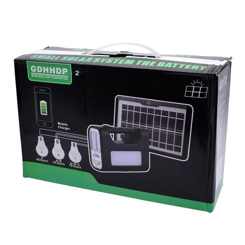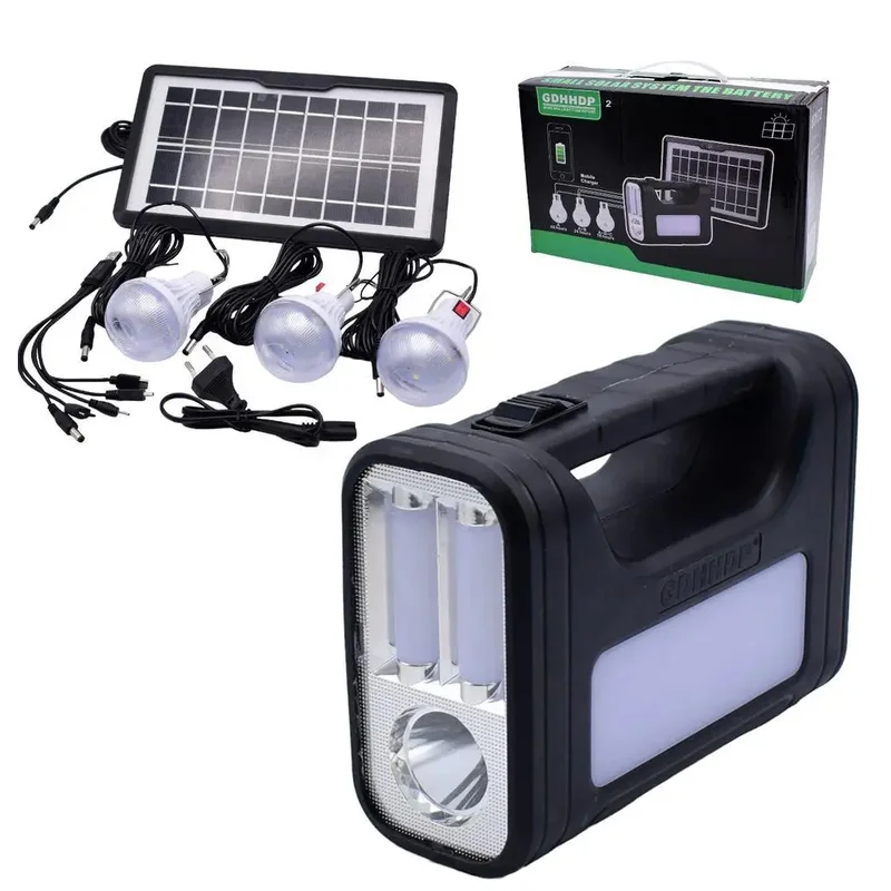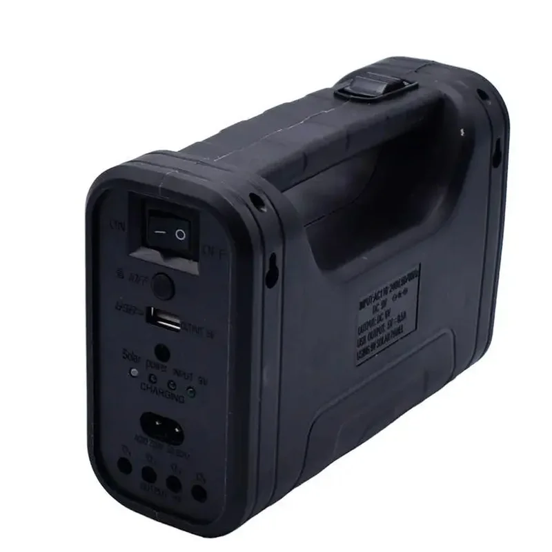 Цей пристрій призначений для заряду домашніх гаджетів та освітлення в умовах відсутності електроенергії. Акумулятор, що знаходиться всередині блоку (5 ампер.час), заряджається як від сонячної панелі в комплекті, так і від мережі. Сам блок має чотири джерела світла плюс три виносних лампи, з окремими вимикачами. Час  роботи трбох ламп від акумулятора 20 годин. Шнур для заряджання різних гаджетів у комплекті.