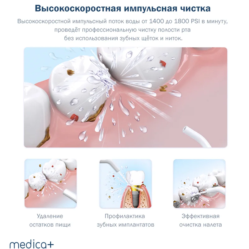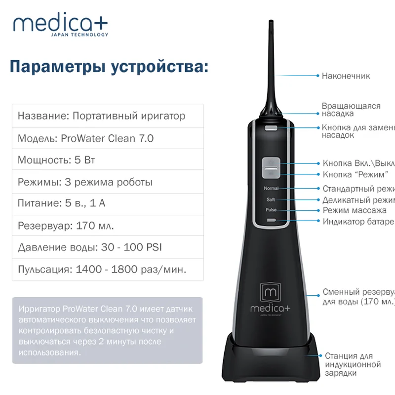 Остання розробка японських технологів MEDICA + допоможе швидко і якісно видаляти не тільки харчові залишки з важкодоступних місць, але також буде успішно справлятися з видаленням зубного нальоту, що утворився. Модель має Український сертифікат СЕС, Європейський ISO/SE/Rohs та Американський FDA. Крім того портативний іригатор ProWatеr Clean 7.0 подарує білосніжну усмішку, забезпечить масаж ясен, запобіжить ймовірність виникнення захворювань десен. Сучасна модель має унікальну конструкцію, завдяки водонепроникній технології IPX7, що дозволяє уникнути поломок двигуна і зарядних елементів. Використовуючи для гігієни порожнини рота портативний іригатор MEDICA + ProWatеr Clean 7.0, він допоможе проникати навіть у важкодоступні місця, де затримуються залишки їжі і видаляти їх, щоб уникнути виникнення численних стоматологічних проблем, як з яснами, так і з зубами. Компактний іригатор не вимагає багато місця, тому ідеально підійде для подорожей і сімейного використання. Ви отримаєте повну дезінфекцію ротової порожнини, видаляючи всі можливі бактерії, що дозволить знизити ймовірність виникнення карієсу і забезпечити свіжість подиху у всієї родини. Переваги Prowater Clean 7.0: - 3 мультифункціональних режими для різних типів очищення; - Підходить для чутливих ясен; - Індукційна бездротова зарядка з вологозахистом; - Робочий час батареї без підзаряду-1 -2 тижні. Режими очищення: "Soft" – (м’який режим софт) призначений для дбайливого чищення чутливих ясен. Даний режим відмінно підійде тим, у кого встановлені коронки або брекети; мостові конструкції; зубні імплантати або просто чутливі ясна. "Normal" – (нормальний режим) підійде для щоденної гігієни порожнини рота, в разі відсутності будь-яких ускладнень. "Pulse" – (інтенсивний режим) високий тиск надає відмінну можливість: позбавлятися від зубного каменю і нальоту; запобігати руйнування зубної поверхні і кровоточивості ясен.