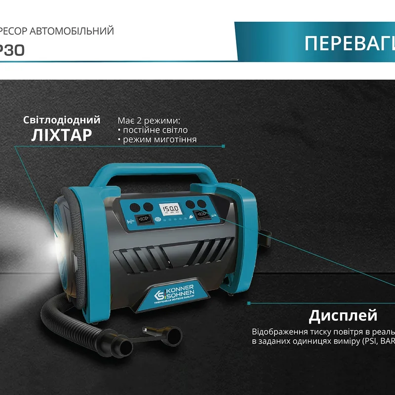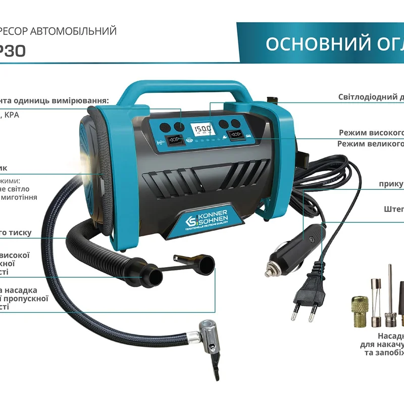 Оснащений функцією автостоп - автоматичне переривання подачі повітря при досягненні визначених параметрів. Має кабель достатньої довжини - 3 м для зручності використання.
