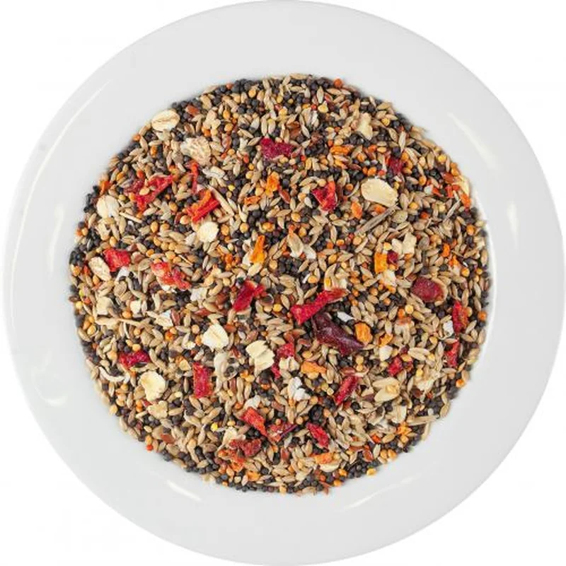 Склад: канаркове насіння, рапс, просо жовте, просо червоне, вівсяна крупа, насіння льону, чумиза, абіссінський нуг, кунжут білий, сушена паприка, сушена морква, насіння конопель, сушене яблуко.