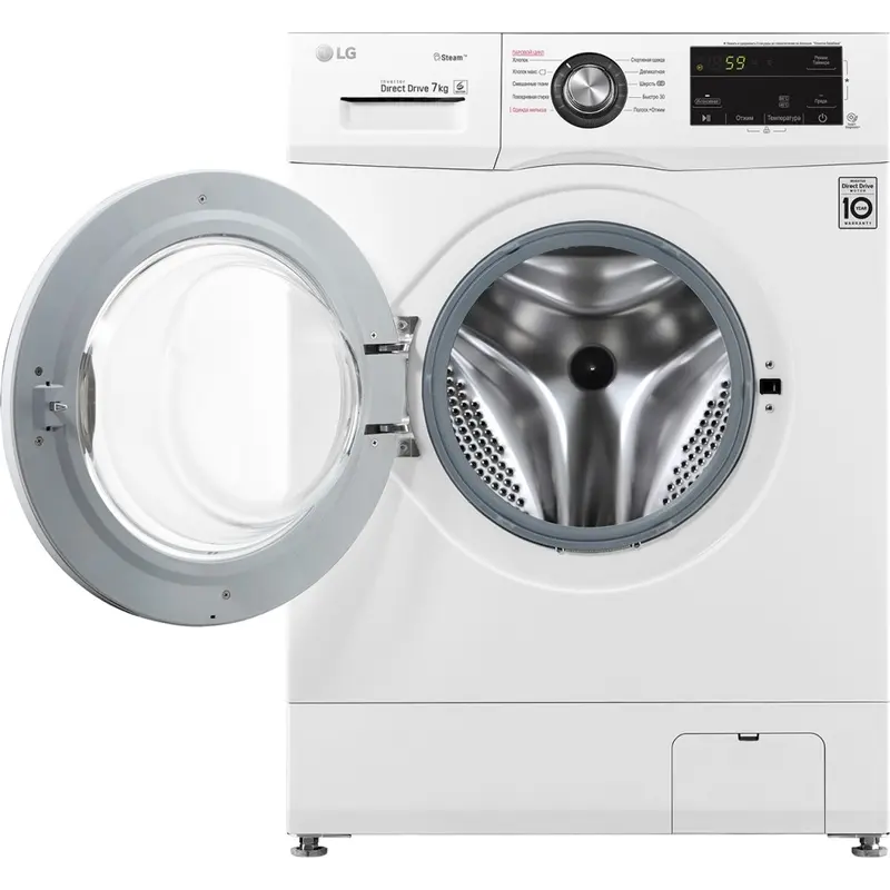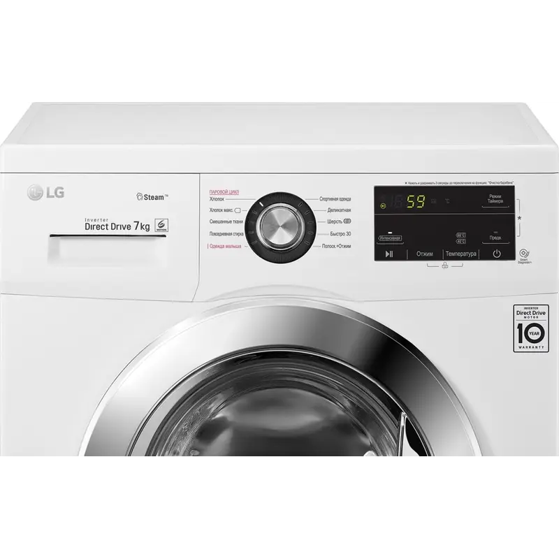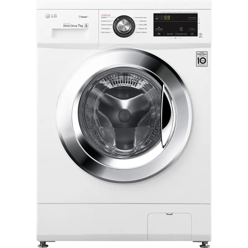 6 motion - 6 рухів турботи На відміну від звичайних пральних машин, барабан LG має широкий набір варіантів обертання, максимально адаптованих до різних типів тканини та рівня забруднення білизни. Inverter Direct Drive Система LG Inverter Direct Drive підвищує ефективність двигуна шляхом відмови від ременя і шківа, а також інверторної технології, що допомогає знизити споживання електроенергії та забезпечує більшу надійність машини. Ця спрощена система також допомагає зменшити рівень шуму. Безшумна робота Відтепер прямий привід Direct Drive настільки тихий, що ви можете використовувати пральну машину навіть уночі, не порушуючи солодкі сни. Рівень шуму прання на 2,5 дБ (блок Кручення) менше у порівнянні зі звичайними пральними машинами. Smart Diagnosis Функція мобільної діагностики SmartDiagnosis дозволяє скоротити час і заощадити гроші в разі виникнення неполадок. Ви можете передати дані для визначення проблеми в центр технічної підтримки або самостійно за допомогою телефону 10 років гарантії Прямий привід Direct Drive, працює на техніці LG тихо та надійно. Ми гарантуємо, що він не підведе. LG надає десять років гарантії на стандартні частини двигуна за рахунок міцності і надійності.