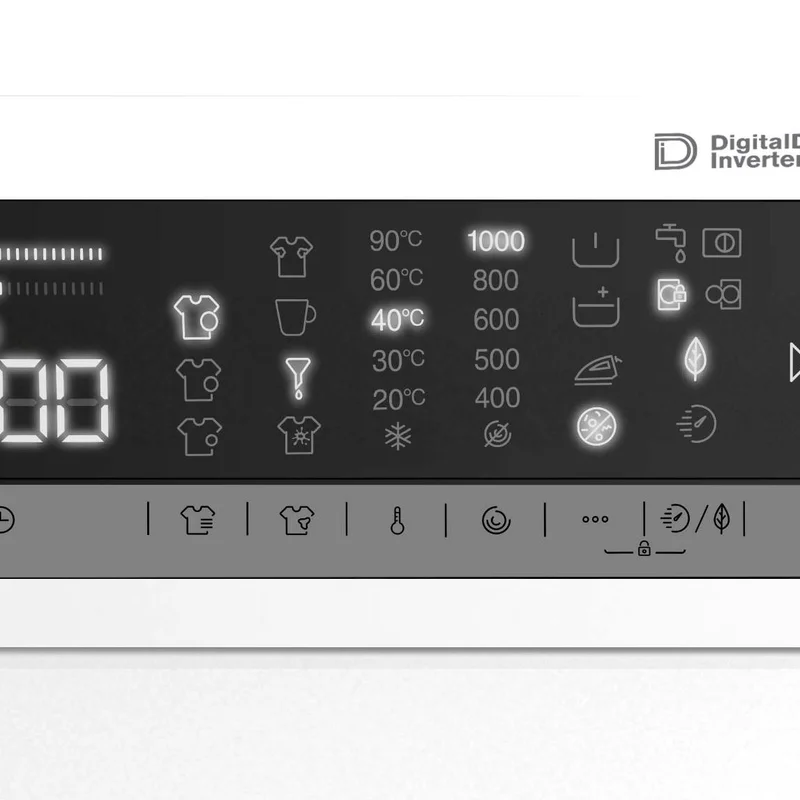 ІНДИКАТОР СПОЖИВАННЯ ЕЛЕКТРОЕНЕРГІЇ Індикатор споживання електроенергії - завдяки індикатору ви зможете контролювати витрату електроенергії та вибирати для себе оптимальну програму ІНВЕРТОРНИЙ МОТОР Інверторний мотор працює помітно тихіше, споживає менше енергії і служить набагато довше ЦИФРОВИЙ ДИСПЛЕЙ З СЕНСОРНИМ КЕРУВАННЯМ Сучасний цифровий дисплей має широкі можливості програмування роботи. Сенсорний інтерфейс є зручною альтернативою традиційним перемикачів і полегшує догляд