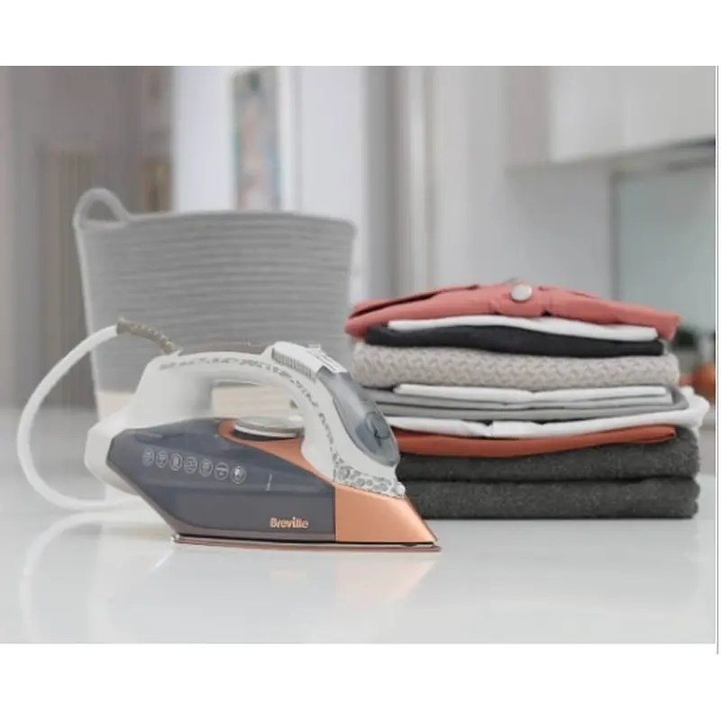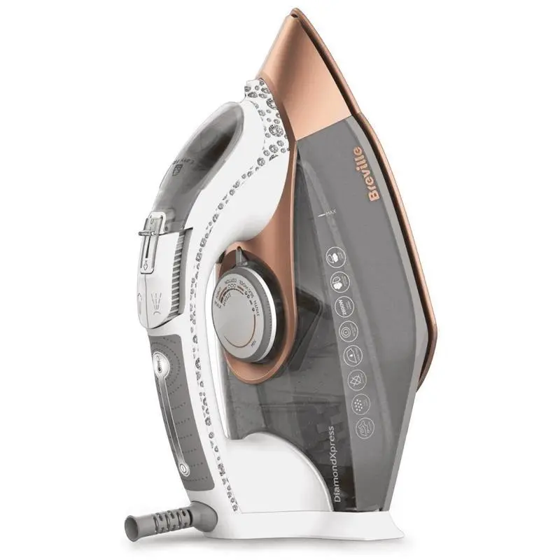 Швидше прасування. BREVILLE Diamond Xpress - це праска, розроблена з думкою про вас. Її видатна продуктивність і корисні функції полегшать прасування та забезпечать швидкий результат. Керамічна підошва. Високоякісна керамічна підошва з подрібненими алмазами забезпечує плавне ковзання по тканині в усіх напрямках. Централізовані парові канали та точний наконечник дозволять вам легко дістатися навіть до важкодоступних місць, наприклад, між ґудзиками та складками. Зручний у використанні. М’яка ручка з індикацією рівня температури робить прасування дуже комфортним, і ви відразу бачите, коли праска готова до роботи. Великий резервуар на 400 мл і широкий впускний отвір для води забезпечать легке використання і тривале прасування без необхідності доливати воду. Блокування від крапель під час прасування запобігає появі плям при використанні праски. Праска має потужність 2800 Вт і продуктивність пари 180 г / хв, а зручна функція вертикального прасування забезпечує ще кращі результати. Безпечне прасування. Праска автоматично вимикається через 30 секунд бездіяльності. Крім того, індикатор температури SELF STORE показує, коли підошва праски достатньо охолоне, щоб її можна було безпечно прибрати після використання. Функція самоочищення. Функція самоочищення видаляє накип і бруд одним натисканням кнопки. Крім того, праска має фільтр для запобігання утворенню накипу. Особливості продукту: - Надзвичайно широка, різноспрямована підошва з алмазної кераміки. - Потужність подачі пари 180 г/хв. - Централізовані парові канали та точний наконечник подають пар саме туди, де він потрібен. - Великий резервуар для води на 400 мл, що легко наповнюється. - Зручна ручка з температурною індикацією. - Корисні функції: автоматичне вимкнення, захист від накипу, захист від крапель під час прасування, функція самоочищення, вертикальна подача пари та шнур живлення довжиною 3 м.