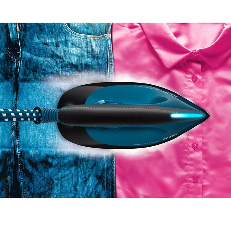Потужна подача пари для чудового розгладження складок. Потужна, постійна подача пари легко справляється зі складками навіть на найщільнішій тканині. Жорсткі складки будуть разглаженими прямо у вас на очах завдяки функції парового удару. Такий додатковий потік пари ідеально підходить для вертикального відпарювання - ви зможете освіжити одяг або штори. Технологія OptimalTEMP: настройка температури не потрібна. Прасуйте одяг з будь-якої тканини, від шовкової до джинсової, без регулювання температури. Технологія OptimalTEMP дозволяє відмовитися від використання регулятора та різних налаштувань. Вам більше не доведеться попередньо сортувати білизну або чекати, поки праска нагріється або охолоне, - прасуйте речі з будь-яких тканин у будь-якому порядку. Безпечно для всіх тканин, що допускають прасування; без ризику пропалити тканину. Ми гарантуємо, що завдяки технології OptimalTEMP праска безпечна для будь-яких тканин, що допускають прасування. Праску можна залишати на одязі або прасувальній дошці - підошва не залишить слідів і блиску. Великий резервуар для тривалого використання. Прозорий резервуар об'ємом 1,5 літра забезпечує 1,5 години безперервного використання. Вам буде добре видно, скільки води залишилося в резервуарі, а завдяки широкому отвору ви зможете легко наповнювати його під краном. Контейнер Calc-Clean у комплекті - очищення без картриджів і зайвих витрат. Вбудована система Smart Calc-Clean нагадає про необхідність очищення від накипу. Тепер для очищення від накипу не потрібно купувати додаткові картриджі завдяки спеціальному контейнеру в комплекті. Економія енергії в режимі ECO. Економте електроенергію, при цьому отримуючи відмінні результати. У режимі ECO можна скоротити енергоспоживання, коли для будь-яких речей потрібна менш потужна подача пари. Компактна конструкція і невелика вага для простого використання і зберігання. Завдяки малій вазі та розмірам прилад відмінно поміщається на прасувальній дошці та його дуже зручно зберігати. Першокласна технологія ProVelocity дозволила зробити наші парогенератори набагато меншими та компактнішими порівняно з усіма попередніми моделями. Фіксація Carry Lock для зручного та безпечного перенесення. Надійна фіксація праски на базовій станції для зручного перенесення і скорочення ризику випадкового дотику до гарячої підошви. Електронна функція вимкнення вимикає залишену без нагляду праску. Завдяки функції автоматичного вимкнення парогенератор вимикається автоматично, якщо не використовується протягом декількох хвилин. Це дозволяє економити енергію і забезпечує безпеку. Стійка до подряпин підошва SteamGlide забезпечує легке ковзання. Наша особлива підошва SteamGlide з антипригарним і стійким до подряпин покриттям легко ковзає по будь-якій тканині. Її також легко очищати.