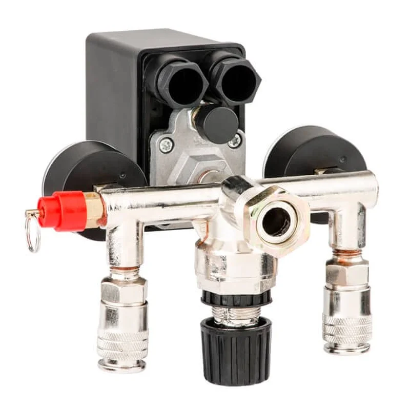 Пресостат в зборі, або реле тиску (блок керування), призначений для контролю тиску в ресивері компресора за заданими параметрами в автоматичному режимі. Використовується для однофазних повітряних поршневих компресорів з напругою 220 В, з максимальною потужністю - до 3 кВт.