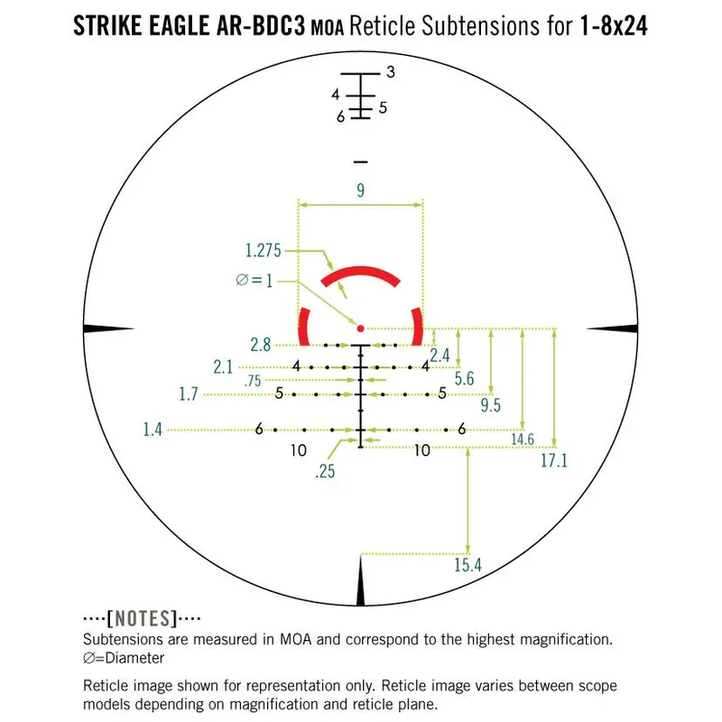 Модель Strike Eagle 1-8x24 FFP відрізняється підсвічуваною прицільною сіткою EBR-8, розташованою в першій фокальной площині. Візир з BDC позначками допоможе моментально реагувати на мінливу обстановку. Багаторівневе підсвічування дасть змогу адаптувати видимість під будь-який рівень освітленості. Два найслабші рівні підходять для спільного використання з приладами нічного бачення (ПНБ).