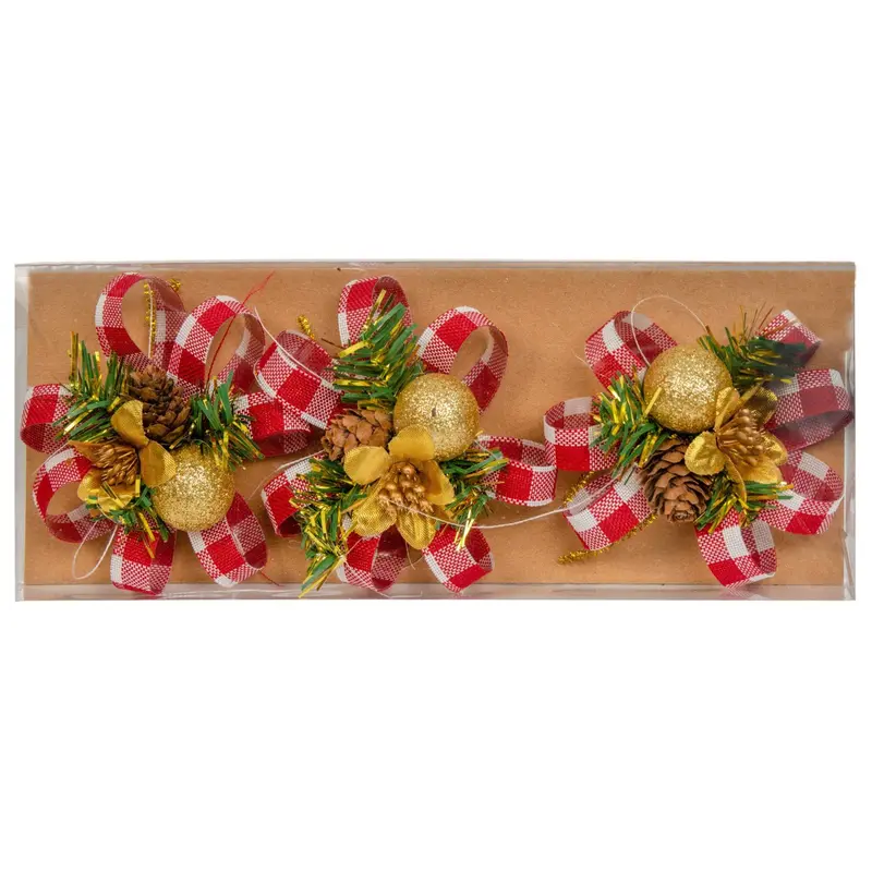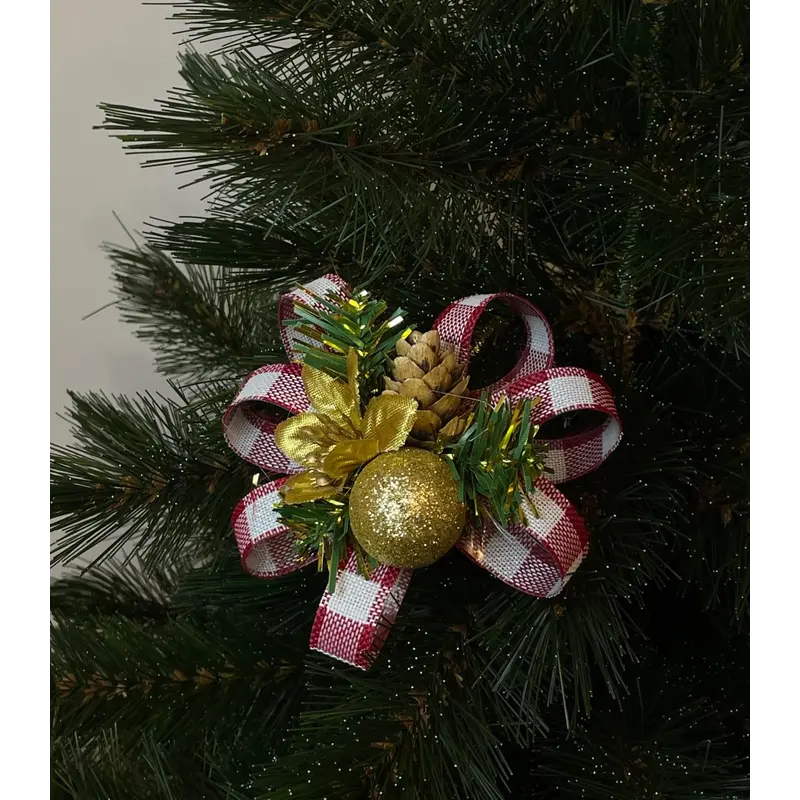 Декоративний набір Chomik включає три вишукані прикраси діаметром 11 см, в яких золотисті кульки гармонійно поєднуються з натуральними шишками і штучною хвоєю. Додатковий акцент створює декоративна стрічка в червоно-білу клітинку, що надає композиції затишок і традиційний святковий настрій. Кульки покриті блискітками, що робить їх особливо виразними при світлі гірлянд і свічок.Особливості Поєднання золотистих куль, натуральних шишок, штучної хвої та текстильної стрічки створює святкову композицію з ефектним контрастом текстур і кольорів. Блискуче покриття надає кулькам сяючий вигляд, особливо помітний при електричному та денному освітленні. Натуральні елементи в поєднанні з декоративними деталями формують стильний акцент, що підходить для класичного та сільського стилю оформлення. Кріплення на декоративному дроті дозволяє легко розміщувати прикраси в потрібному місці і фіксувати їх без додаткових аксесуарів. Упаковка в прозору пластикову коробку забезпечує збереження форми і зручність при зберіганні до наступного сезону.Варіанти використання Ідеальні для прикраси новорічної ялинки, створюючи виразні композиції і яскраві акценти серед зелені гілок. Чудово підійдуть для декору віночків, гірлянд або настільних композицій, доповнюючи їх натуральними і блискучими елементами. Використовуються для святкового оформлення фотозон, вітрин або банкетних залів, де потрібен яскравий і затишний акцент. Можуть стати стильним доповненням подарункової упаковки, перетворюючи її в повноцінний святковий елемент.*Реальний колір товару може дещо відрізнятися від зразків, представлених на сайті, залежно від технічних налаштувань Вашого екрану, а також, з огляду на особливості матеріалу, відтінок товару може змінюватися залежно від освітлення.