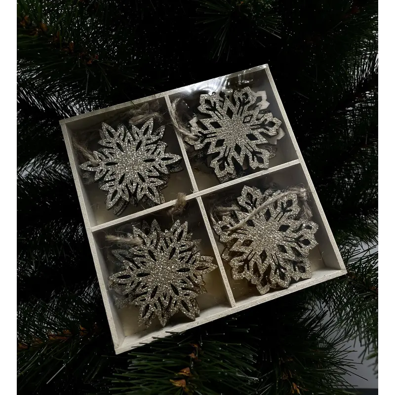 Прикраси новорічні підвісні "Cніжинки" House of Seasons, комплект 16 шт, дерев'яні шампаньКоли наближаються різдвяні свята — новорічного декору багато не буває!Особливістю представленого набору є вдала комбінація двох видів сніжинок (по 8 шт) у кольорі* шампань. При потраплянні світла прикраси заграють сяючими переливами завдяки блискіткам, якими покриті підвіски.Ялинкові іграшки з року в рік несуть символічну урочистість свята, що наближається. Унікального колориту новорічному дереву нададуть дерев'яні підвіски традиційних зимових атрибутів, що випромінюватимуть затишок та тепло у вашій оселі.Залишається лише вдягнути прикраси на вашу ялиночку — ефект святковості та урочистості забезпечено!*Реальний колір товару може дещо відрізнятися від зразків представлених на сайті залежно від технічних налаштувань Вашого екрану, а також, зважаючи на особливості матеріалу, відтінок товару може змінюватися залежно від освітлення.