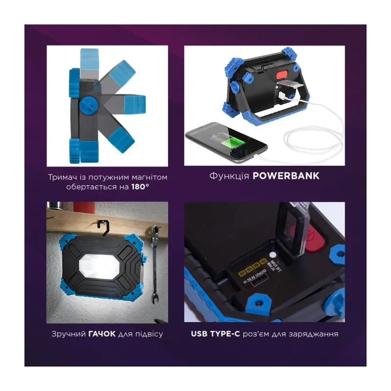 Прожектори ELM Vinter з акумулятором та функцією Powerbank забезпечать яскраве освітлення в будь-яких умовах і стануть незамінним помічником у безлічі ситуацій, а високий ступінь захисту від вологи та пилу дозволить використовувати його як усередині, так і зовні приміщень. Дані прожектори оснащені сучасними світлодіодами, які забезпечують потужне та яскраве освітлення (до 100 Лм/Вт). Ви зможете використовувати їх як у приміщеннях, так і на відкритому повітрі, забезпечуючи комфортний рівень освітлення навіть у темну пору доби. ELM Vinter обладнано вбудованим акумулятором, який можна легко та зручно перезарядити за допомогою стандартного кабелю USB Type-C. Це забезпечує зручність та економію, тому що вам не потрібно купувати додаткові батареї. Однією з найбільш корисних особливостей цієї моделі є функція Powerbank. Завдяки цьому ви можете заряджати свої мобільні пристрої (телефони, планшети та інші гаджети) прямо від акумулятора прожектора, що робить його чудовим вибором для кемпінгу, подорожей та екстрених ситуацій. Прожектори обладнані ручкою, що обертається, на 180 град. із вбудованим магнітом. Також на корпусі розташований складний гак для підвішування. Все це дозволяє закріпити пристрій у будь-якому необхідному місці. ELM Vinter мають компактні розміри та легку вагу, що робить їх чудовим вибором для використання на відкритому повітрі та активного способу життя. Вони прості у транспортуванні та не займуть багато місця у вашому рюкзаку чи сумці. Регульовані режими освітлення Залежно від ваших потреб, прожектори Vinter пропонують кілька режимів освітлення, які можна налаштувати відповідним чином. Від яскравого освітлення для активних видів спорту до приглушеного світла для розслаблюючого вечора на природі. Довгий термін служби: Наші прожектори створені із міцних матеріалів та обладнані передовими технологіями, що забезпечує їхній тривалий термін служби без погіршення якості світла. особливості: Висока світловіддача до 100 Лм/Вт Вбудований літій-іонний акумулятор 4400 мАг IP54 Можливість використовувати прожектор як повербанк 2 режими роботи. Перемикання режимів кнопкою на задній частині пристрою Індикатор заряду Час роботи на одному заряді батареї від 2 до 4 годин залежно від режиму Повна зарядка займає до 5 годин Кабель USB-C у комплекті Складний гак для підвішування та ручка з потужним вбудованим магнітом для кріплення на поверхнях