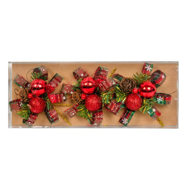 Набір декоративних прикрас Chomik включає три стильних композиції діаметром 11 см, виконані в насиченому червоному кольорі. Кожен виріб складається з блискучих і матових кульок, доповнених натуральною шишкою, штучною хвоєю і декоративною стрічкою зі святковим орнаментом. Таке поєднання створює виразний акцент і надає інтер'єру яскравий новорічний настрій. Блискуче покриття кульок підсилює ефект сяйва при попаданні світла, а кріплення на декоративному дроті забезпечує легку фіксацію на ялинці, гірляндах або вінках.Особливості Червоні кульки з глянцевим і блискучим покриттям надають композиції насиченості і урочистості, ідеально підходячи для новорічного декору. Натуральна шишка і штучна хвоя додають виробу об'єм і натуральні акценти, гармонійно поєднуючись з яскравими декоративними елементами. Глітерне покриття створює ефект сяйва, який особливо красиво виглядає при електричному або свічковому освітленні. Кріплення на декоративному дроті дозволяє легко розміщувати прикраси на гілках ялини або в інтер'єрних композиціях. Зручна упаковка в прозору пластикову коробку забезпечує збереження виробів і їх акуратне зберігання до наступного сезону.Варіанти використання Чудово підходять для декору новорічної ялинки, створюючи яскраві акценти і додаючи глибину композиції. Можуть використовуватися для прикраси святкових вінків, настільних композицій або гірлянд, надаючи їм насиченість і виразність. Відмінний вибір для оформлення фотозон, вітрин або банкетних залів, де потрібен барвистий і святковий акцент. Стануть стильним доповненням подарункової упаковки, надаючи їй оригінальність і урочистий вигляд.*Реальний колір товару може дещо відрізнятися від зразків, представлених на сайті, залежно від технічних налаштувань Вашого екрану, а також, з огляду на особливості матеріалу, відтінок товару може змінюватися залежно від освітлення.