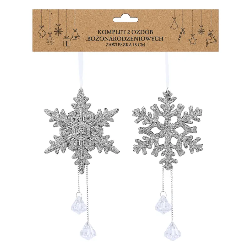 Прикраса-підвіска з кристалами "Сніжинки" Chomik, комплект 2 шт, 18 см, срібнийЯлинкові іграшки з року в рік несуть символічну урочистість свята, що наближається! Відчуття чарівності і казковості вашому новорічному дереву нададуть витончені підвіски сріблястого відтінку* у формі сніжинок двох видів, які входять до представленого комплекту. Особливістю прикрас є сяючі кристали, що звисають знизу на ланцюжках, надаючи виробам вишуканості та урочистості. Поверхня підвісок рясно покрита блискітками, що забезпечують привабливий ефект сяйва. Придбавши комплект "Сніжинки" Chomik, ви отримаєте гарний різдвяний елемент декору, який випромінюватиме енергетику позитиву і затишку у вашій оселі та точно не залишить нікого байдужим.*Реальний колір товару може дещо відрізнятися від зразків представлених на сайті залежно від технічних налаштувань Вашого екрану, а також, зважаючи на особливості матеріалу, відтінок товару може змінюватися залежно від освітлення.