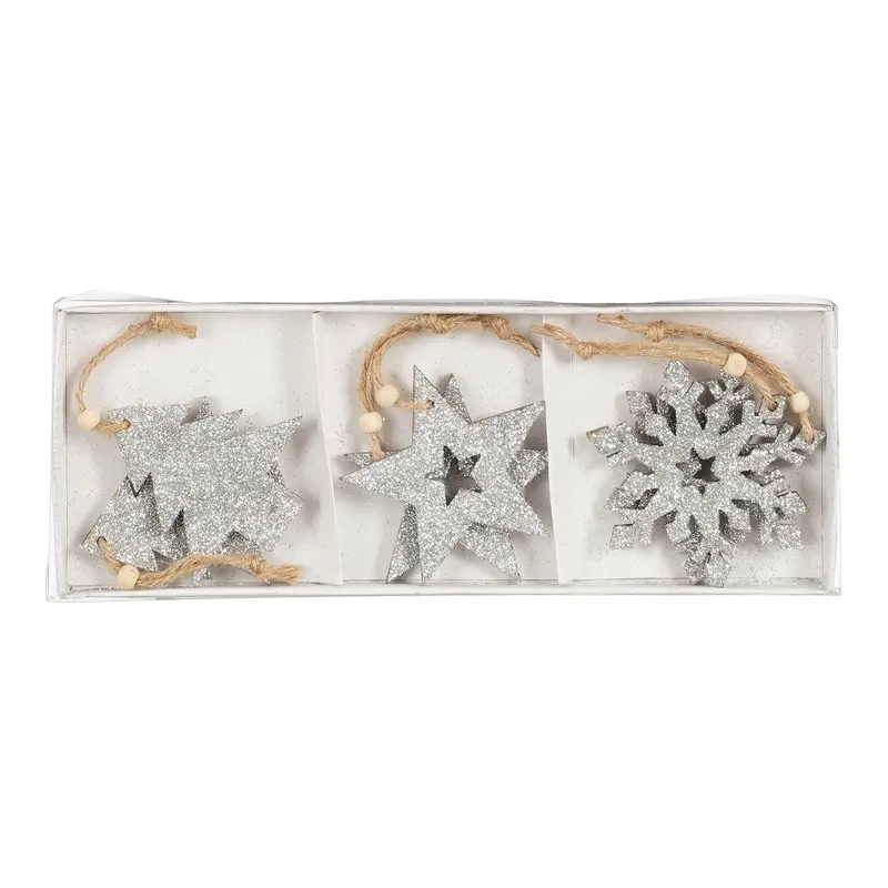 Прикраси новорічні підвісні "Сніжинки, зірки та ялинки" House of Seasons", комплект 6 шт, дерев'яні, сріблястіКоли наближаються різдвяні свята — новорічного декору багато не буває!Особливістю представленого набору є вдала комбінація прикрас-підвісок у вигляді сніжинок, зірок та ялинок (по 2 шт). Завдяки оздобленню сріблястими блискітками при потраплянні світла прикраси заграють сяючими переливами. А кріплення на джгуті та дерв'яна бусинка на ньому додають своєрідної автентичності виробу.Ялинкові іграшки з року в рік несуть символічну урочистість свята, що наближається. Дерев'яні підвіски традиційних зимових атрибутів нададуть унікального колориту новорічному дереву та випромінюватимуть затишок та тепло у вашій оселі.Залишається лише вдягнути прикраси на вашу ялиночку — ефект святковості та урочистості забезпечено!*Реальний колір товару може дещо відрізнятися від зразків представлених на сайті залежно від технічних налаштувань Вашого екрану, а також, зважаючи на особливості матеріалу, відтінок товару може змінюватися залежно від освітлення.
