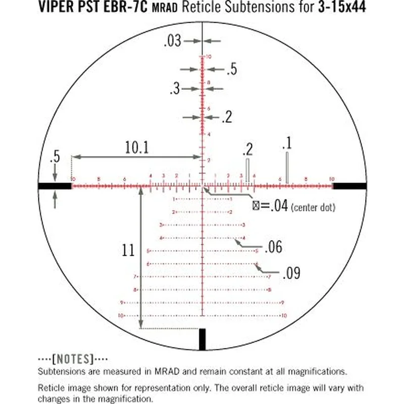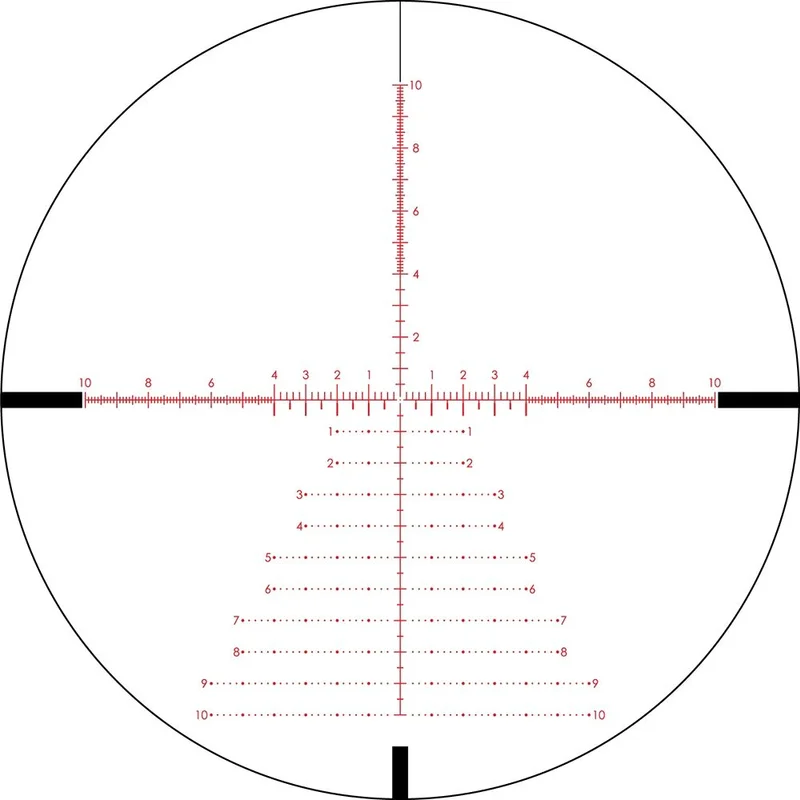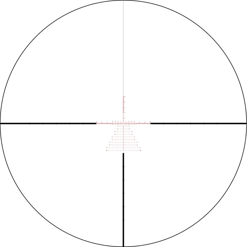 - Прицільна сітка розташована в першій фокальній площині, тобто розмір прицільної марки змінюється пропорційно зміні кратності збільшення зображення. При цьому кутові розміри прицільної марки зберігаються незмінними, що полегшує вимірювання дистанції при будь-якому збільшенні. При цьому прицільна марка витравлена на склі і захищена двома шарами скла, що гарантує надійність і довговічність конструкції.