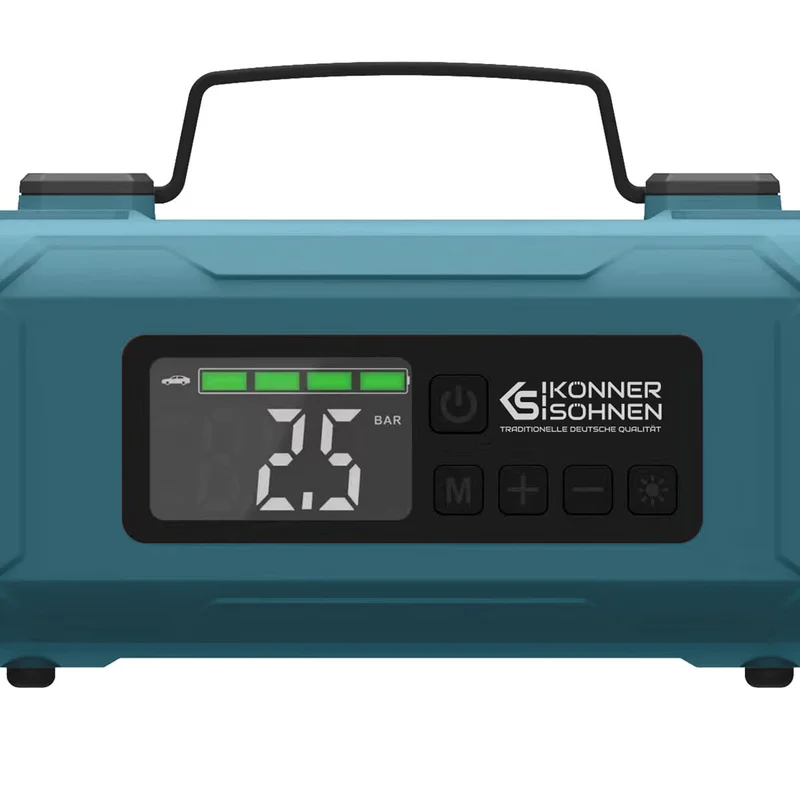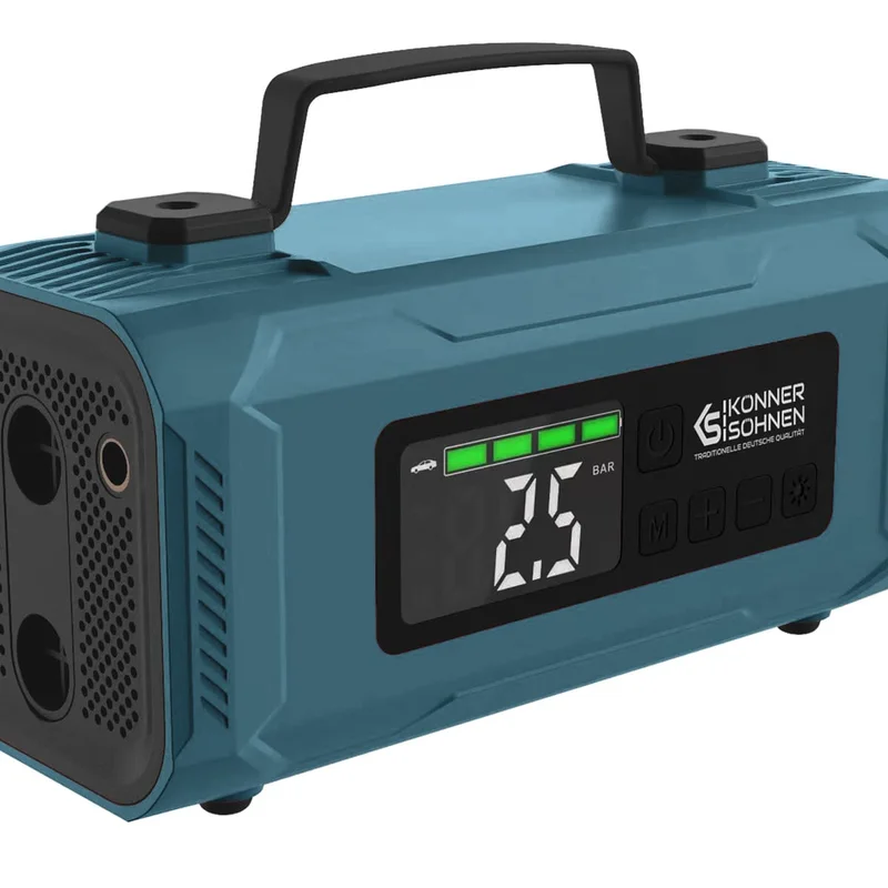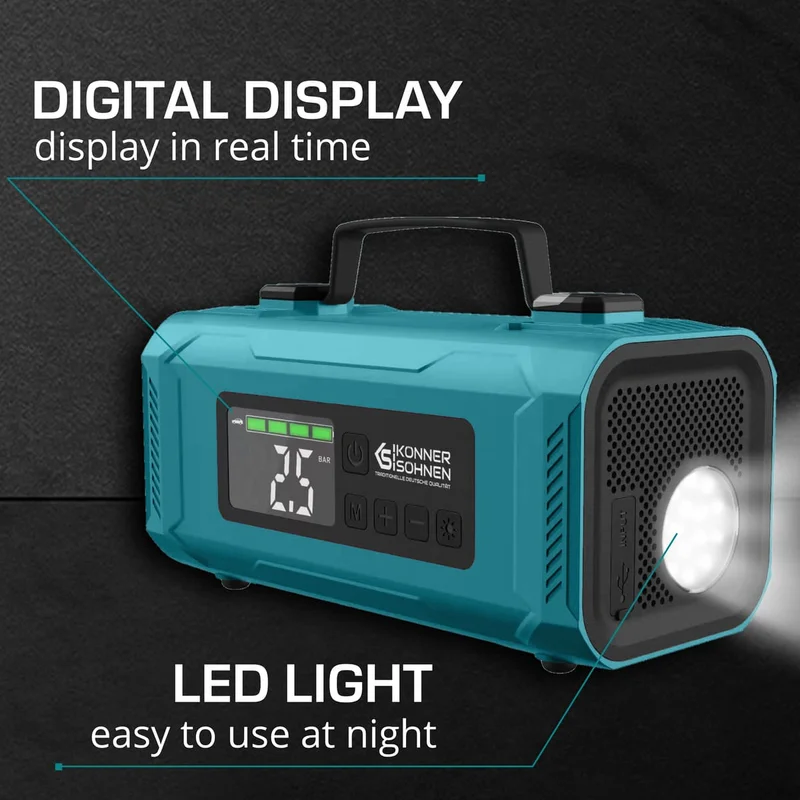 Повітряний акумуляторний компресор високого тиску 140 PSI має швидкість накачування 22 л/хв, дозволяє швидко накачувати та здувати обладнання без необхідності підключення до джерела живлення. Також можна використовувати як манометр для визначення тиску в шинах.