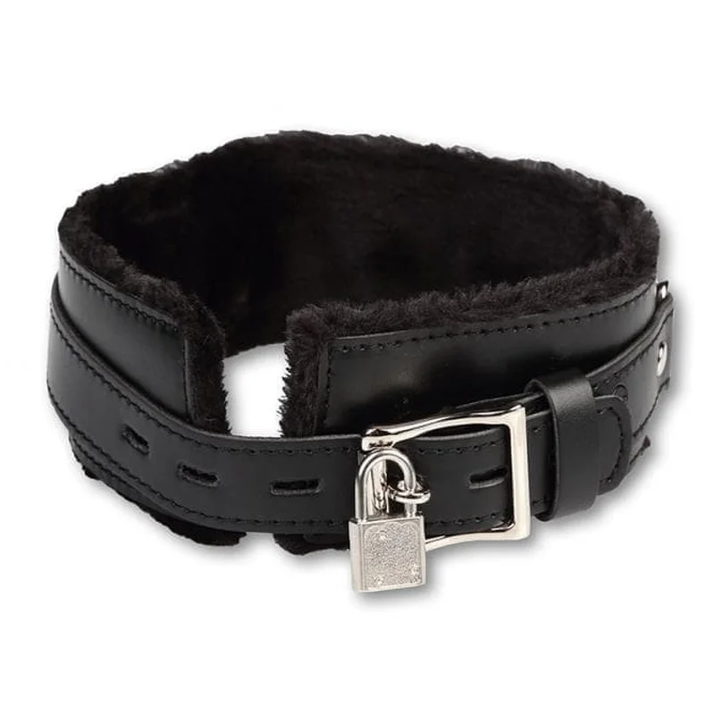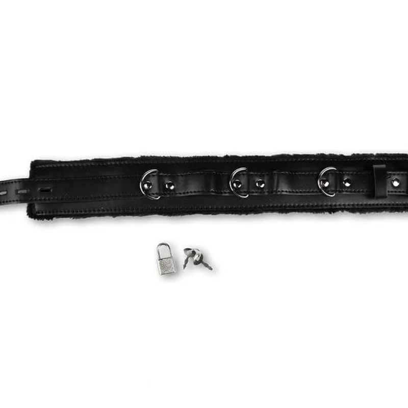 Широкий ошейник подшит с внутренней стороны искусственным мехом, безопасен и комфортен для долгого использования и подходит даже для новичков. Декорирован металлическими заклепками и снабжен тремя полукольцами, к которым можно пристегивать любые другие девайсы.