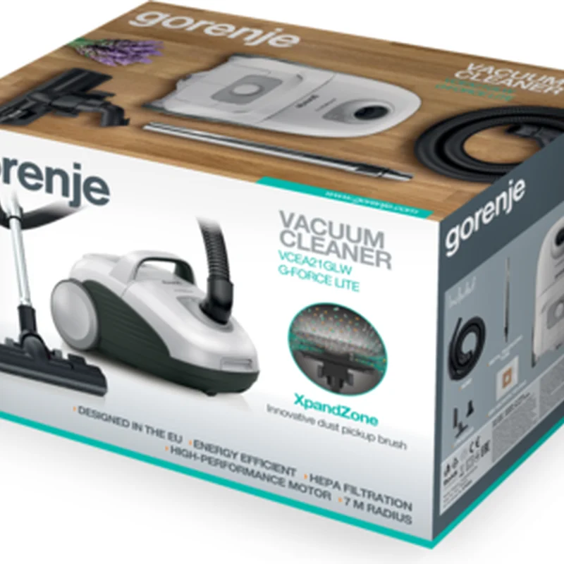 Велика щітка XpandZone Х-образний отвір великої універсальної щітки XpandZone збільшує площу всмоктування пилу з килимів, твердих поверхонь і паркету. Це підвищує ефективність прибирання та економить час. Контейнер для пилу Прозорі стінки великого контейнера дозволяють бачити, коли його потрібно очистити. Витрусіть пил, встановіть контейнер на місце і користуйтеся ним стільки, скільки хочете. Прогумовані коліщатка Прогумовані коліщатка запобігають ушкодженню делікатних підлогових покриттів, наприклад, паркету і забезпечують постійний контакт з поверхнею. Пилосос не залишає слідів і подряпин на гладких і твердих поверхнях. Автозмотування шнура Автоматичне змотування шнура дозволяє швидко прибрати шнур всередину пилососа після завершення збирання. Є штатним обладнанням всіх пилососів Gorenje.