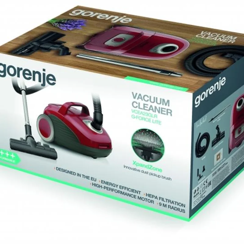 Щітка XPANDZONE Унікальна конструкція щітки. Х-подібний отвір великої універсальної щітки XpandZone збільшує площу всмоктування пилу з килимів, твердих поверхонь і паркету. Завдяки формі отвору пил затягується навіть по краях щітки. Це підвищує ефективність прибирання та економить час. Безтурботне прибирання пилососом. Пилосос оснащено дуже міцним гумовим амортизатором, який захищає меблі та сам прилад від ударів. Тепер вам не потрібно про це хвилюватися. Плавний рух по будь-якій поверхні. Гумові колеса запобігають пошкодженню делікатних підлог та забезпечують надійне зчеплення. Пилосос не залишає слідів і подряпин під час руху по гладеньких або шорстких поверхнях. 3 насадки. До пилососа додається набір із 3 додаткових насадок, що спрощують прибирання вашого дому: насадка для щілин, для меблів і маленька щіточка. Індикатор наповнення мішка або відсіку. Індикатор сповістить, коли мішок або відсік для сміття буде заповнений і його потрібно буде замінити або спорожнити. У цьому дві переваги: підвищення ефективності очищення та захист двигуна від перевантаження. Коли мішок або відсік для сміття заповнено, збільшується опір повітрю, яке проходить через пилосос, що підвищує навантаження на двигун. Автоматичне змотування кабелю. Автоматичне змотування кабелю передбачено в стандартній комплектації пилососів Gorenje. За допомогою цієї технології кабель автоматично змотується в корпус приладу.
