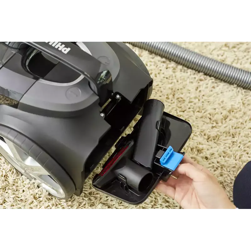 Мотор 900 Вт для високої потужності всмоктування Високопродуктивний мотор 900 Вт забезпечує понад 50 000 об / хв для стабільно потужної і ретельного прибирання. Збирає 99.9% пилу для ефективного очищення Насадка TriActive + і висока потужність всмоктування забезпечать збір 99.9% дрібного пилу PowerCyclone 8 забезпечує максимальну потужність всмоктування ехнологія PowerCyclone 8 створює завихрення повітря для прискорення повітряного потоку і максимальної потужності всмоктування. Швидкий потік повітря в циліндричної камері ефективно відокремлює пил від повітря зі швидкістю понад 185 км / год, підтримуючи високу потужність всмоктування тривалий час для ефективного очищення. Allergy Lock затримує пил для гігієнічної прибирання Система Allergy Lock за допомогою датчика визначає герметичність мішка перед початком роботи, а також затримує пил і алергени всередині пристрою для максимально гігієнічної прибирання. Насадки TriActive + підходять для ефективного очищення будь-яких типів підлогових покриттів Насадка TriActive виконує 3 дії одночасно. Через велике переднє отвір всмоктуються великі частки бруду і пилу, в той час як спеціальна підошва очищає від пилу килимові покриття. Повітря проходить через щітки по краях насадки, що допомагає збирати пил і бруд уздовж стін і предметів меблів. Зберігання аксесуарів у корпусі: зручно, завжди під рукою Аксесуари зберігаються всередині відсіку в задній частині корпусу, тому їх завжди можна легко знайти і встановити на пристрій. Функція цифрового управління потужністю для настройки Функція цифрового управління потужністю дозволяє одним дотиком кнопки регулювати рівень потужності для різних типів прибирання, наприклад твердих підлогових покриттів або м'яких меблів. Конструкція пилозбірника призначена для гігієнічного очищення однією рукою Конструкція пилозбірника призначена для гігієнічного очищення однією рукою - тепер ви зможете забути про клубах пилу при його спустошенні. М'яка щітка, вбудована в ручку, завжди готова до використання Щітка для пилу вбудована в ручку, тому при необхідності очищення меблів і оббивки вона завжди буде під рукою. Щітка Super Turbo ідеально підійде для ретельного очищення від шерсті тварин і пилу Щітка Super Turbo ретельно очищає килимові покриття завдяки обертанню в сторону насадки, яка дозволяє позбутися від шерсті тварин і навіть найдрібніших частинок пилу, що забезпечує оптимальний результат прибирання. Ідеально для власників домашніх тварин. Система фільтрації Allergy H13 утримує> 99.9% дрібного пилу Система фільтрації Allergy H13 затримує> 99.9% часток пилу, включаючи пилок, шерсть тварин і пилових кліщів - ідеально для людей, які страждають алергією. Рівень фільтрації відповідає стандарту HEPA 13. Схвалено Allergy UK Схвалено Allergy UK - протестовано і підтверджено видалення / усунення алергенів з середовища.