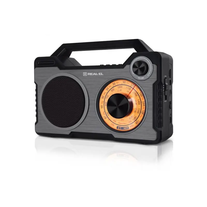 Радіоприймач REAL-EL X-703 - один із старших представників лінійки приймачів від REAL-EL, що має максимальний спектр можливостей. Основна його функція - звичайно, прослуховування радіоефіру. Вбудований тюнер дозволяє слухати FM/AM та короткохвильове SW-радіо. За впевнений прийом в будь-яких умовах відповідає поворотна телескопічна антена. REAL-EL X-703 — не просто радіоприймач, а справжній мобільний аудіоцентр. Крім прийому радіопрограм, він може виступати в якості Bluetooth-колонки та підключатися до зовнішніх джерел сигналу за допомогою дроту. Наявність зовнішнього плеєра при цьому необов’язкове, пристрій підтримує відтворення MP3-файлів з накопичувачів USB-flash і карт microSD Дизайн пристрою витримано в класичному для радіоприймачів форматі, але при цьому він не позбавлений оригінальності. Особливу увагу звертає на себе кругла шкала радіочастот з підсвічуванням, ручка на якій служить для настройки. Абсолютно всі органи управління, включаючи кнопки управління вбудованим плеєром, є досить великими і дуже зручними в роботі. Звучить приймач голосно й розбірливо завдяки підсилювачу потужністю 8 Вт та динаміку діаметром 90 мм. Довгострокову автономну роботу гарантує літій-іонний акумулятор ємністю 1500 мАг, заряджати який можна від будь-якого пристрою з USB-виходом за допомогою кабелю, що йде в комплекті. Радіоприймач REAL-EL X-703 - відмінне рішення для тих, хто любить радіо, але іноді краще слухати власну колекцію музики. З ним у вас завжди буде вибір! Приймач вже з’явився на полицях магазинів електроніки та побутової техніки. Купити портативний радіоприймач ви можете в нашому магазині з доставкою по всій Україні. Прийшов на заміну SVEN SRP-755 Особливості Бездротова передача сигналу по Bluetooth Підтримувані профілі Bluetooth: HSP, HFP, A2DP, AVRCP Радіус дії до 10 м. Підсвічування шкали радіо Вбудоване FM/AM/SW радіо Відтворення музики з USB flash і microSD card пам’яті Телескопічна поворотна антена Вбудована батарея Можливість дротового підключення до джерела звуку