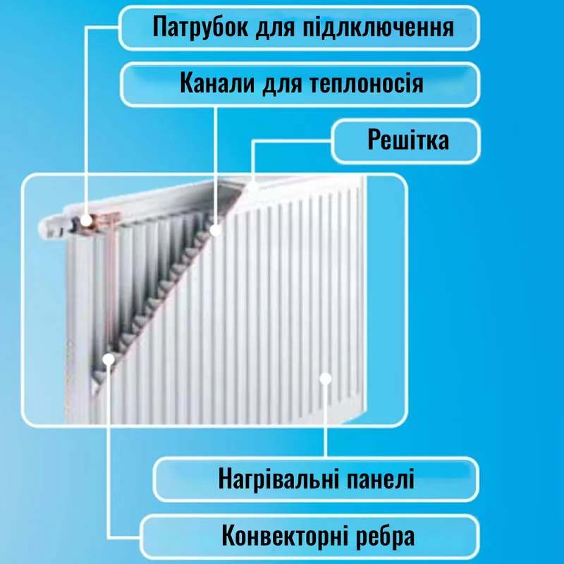 Сталеві радіатори мають гарну тепловіддачу завдяки тому, що передня панель випромінює тепло в приміщення, а решетування нагріває повітря віддає тепло шляхом конвекції.