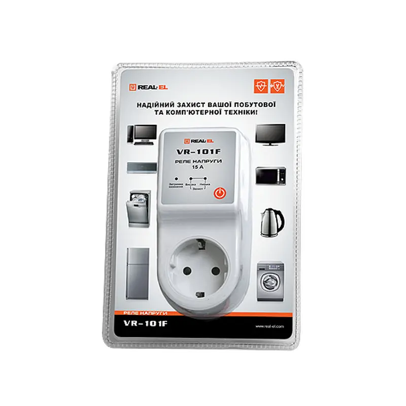 Реле напруги REAL-EL VR-107P призначене для захисту підключених до нього побутових електроприладів (холодильників, пральних машин, комп’ютерів, відео-, аудіотехніки тощо) від недопустимих відхилень напруги живлення та імпульсних перешкод у мережі.