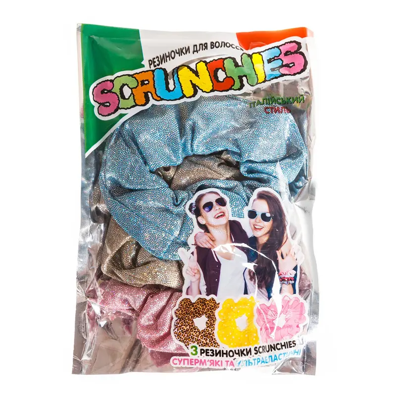 Набір із трьох резинок SCRUNCHIES - це просто блиск! Яскраві аксесуари для зачіски вигідно підкреслять образ та стануть справжньою родзинкою стилю.Три неймовірно комфортні і ультрам'які резиночки чудово тримають форму і не травмують волосся. Вони легко миються та підходять для будь-якого типу волосся.
