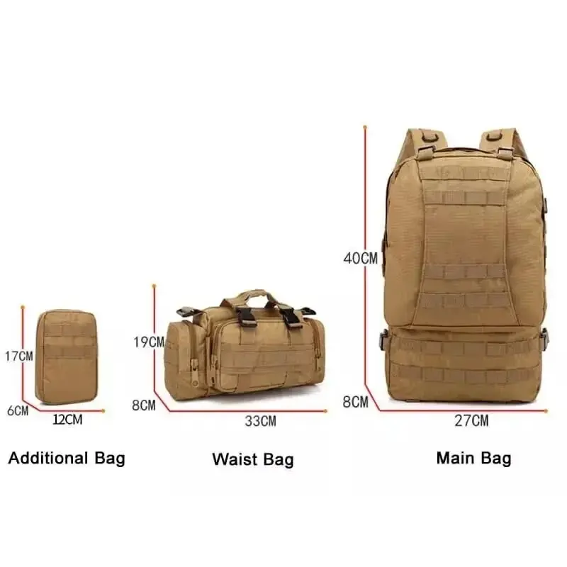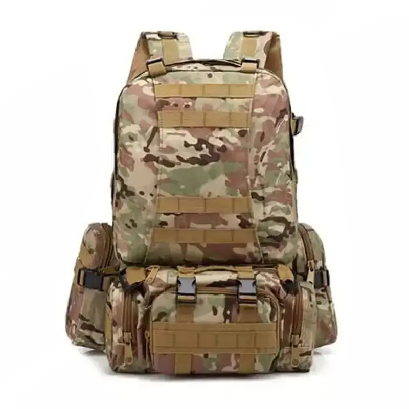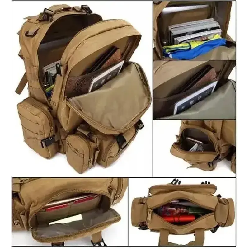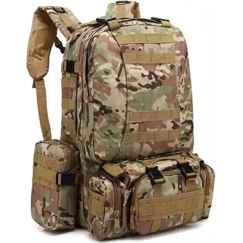 Рюкзак с подсумками олива на 55л - универсальная и очень популярная модель за счет своей функциональности. Благодаря навесным подсумкам рюкзак можно трансформировать под необходимые задачи и количество переносимых вещей. Рюкзак выполнен из высококачественных материалов. На внешней и боковых сторонах нашиты MOLLE-стропы для навески дополнительных подсумков или снаряжения. Имеет множество внутренних и внешних карманов на застёжках, мягкую спинку с вентиляционными ходами, компрессионные стяжки, а также мягкие плечевые ремни. С помощью регулируемых ремней можно легко подогнать рюкзак под себя. Съемные боковые сумки и сумка на поясе могут использоваться отдельно. Сумка в отдельном виде имеет свой собственный ремень через плечо или на пояс. Характеристики: Страна производитель: Китай; Объем: 55 л; Качественный пошив и фурнитура; Материал: Оксфорд 600D; Вес: 1.5 кг; Длина: 22 см; Ширина: 35 см; Висота: 53 см; 8 отсеков на молнии; Регулируемые ремни: плечевой, грудной клетки и пояса; Основное отделение с внутренним карманом; Переднее отделение с внутренним карманом; 2 съёмных боковых сумки с внутренними карманами; Мягкая анатомическая зона спины; Мягкие эргономичные плечевые лямки с D-кольцами регулируются по длине; Регулируемый нагрудный ремень; Стропы МOLLE для дополнительной экипировки.