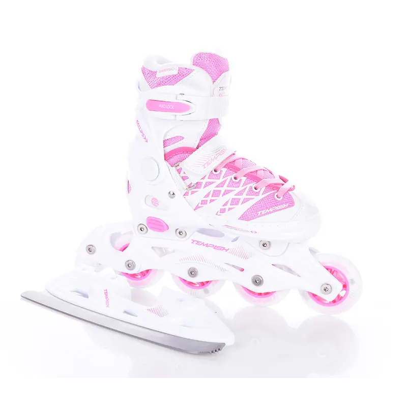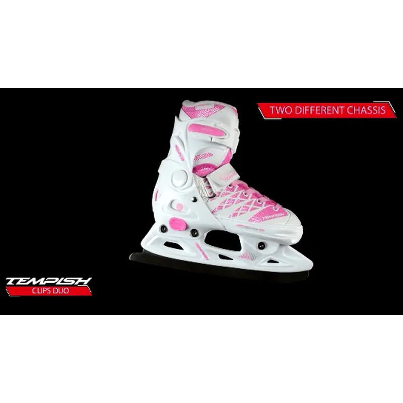 Tempish CLIPS GIRL DUO - детские раздвижные коньки для девочек со специальной конструкцией 2 в 1, которая позволяет кататься круглый год. Предназначены для начинающих и продвинутых роллеров. Простая система позволяет заменить ледовые лезвия на роликовые шасси и наоборот в считанные минуты. Достаточно просто открутить и закрутить 3 винта.