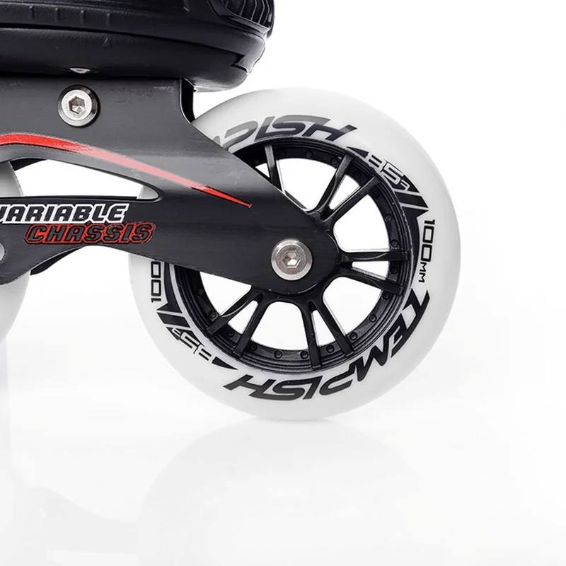 Коньки оснащены колесами TEMPISH RADICAL, которые характеризуются высоким коэффициентом сцепления, поглощением неровностей, низким износом и сопротивлением качению. Колеса вращаются на качественных, высокоточных подшипниках TOP SPEED ABEC 7 CHROME с резиновыми пыльниками, с возможностью чистки, минимальным сопротивлением качению, которое обеспечивают максимально быструю езду.