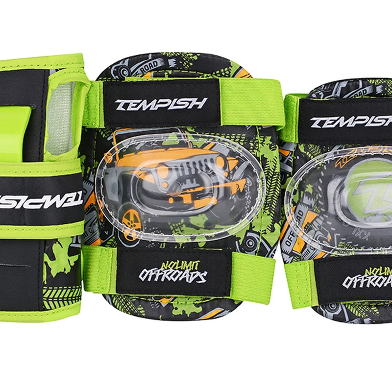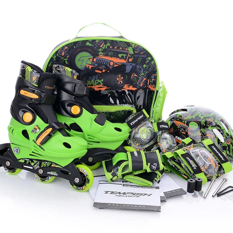 качественный и внешне привлекательный комплект для мальчиков, выполнен в ярких черно-зеленых тонах и включающий в себя все необходимое для начала обучения езде на роликах.