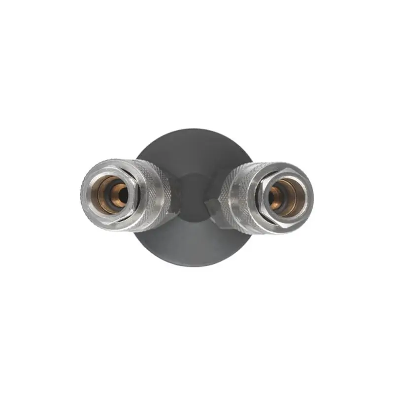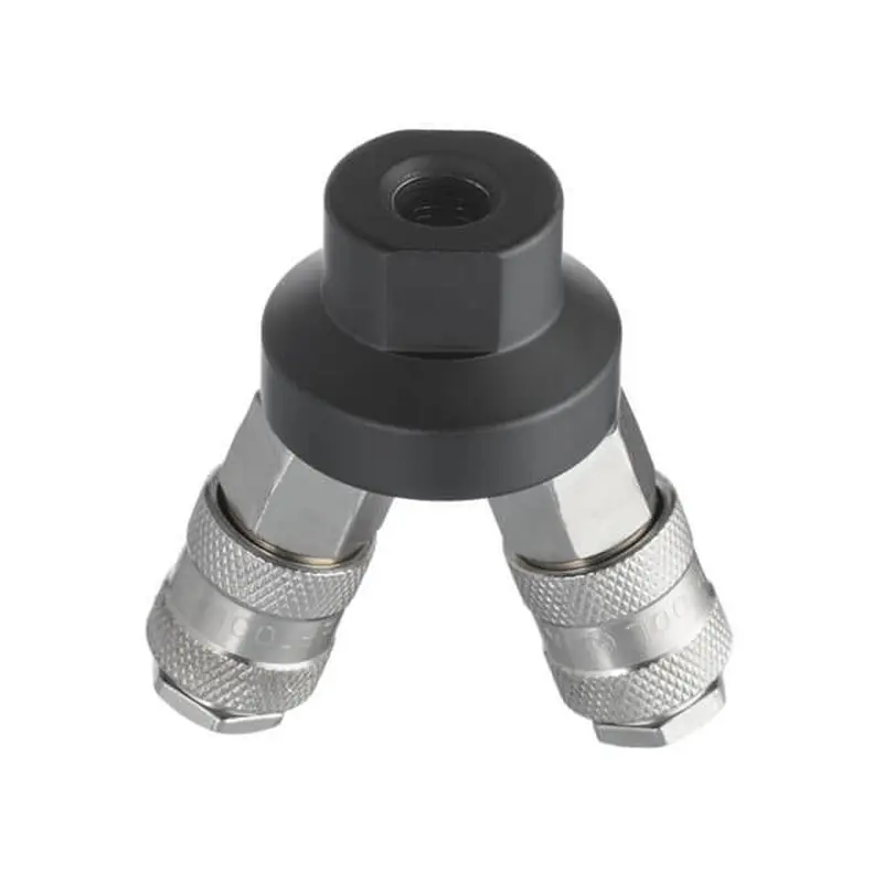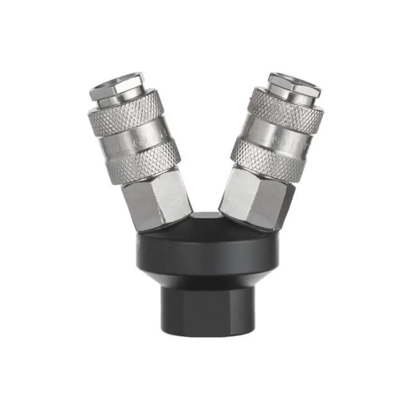 V-подібний розгалужувач повітря дозволяє одночасно під'єднати 2-х користувачів повітря і побудувати потужну пневматичну систему з тиском до 10 бар. На вході повітря встановлена різьба 1/4", а на виходах - надійні універсальні швидкороз'ємні з'єднання, які дозволяють легко підключити шланги високого тиску з пневмоінструментом.