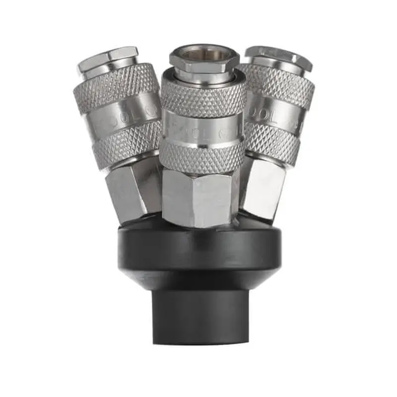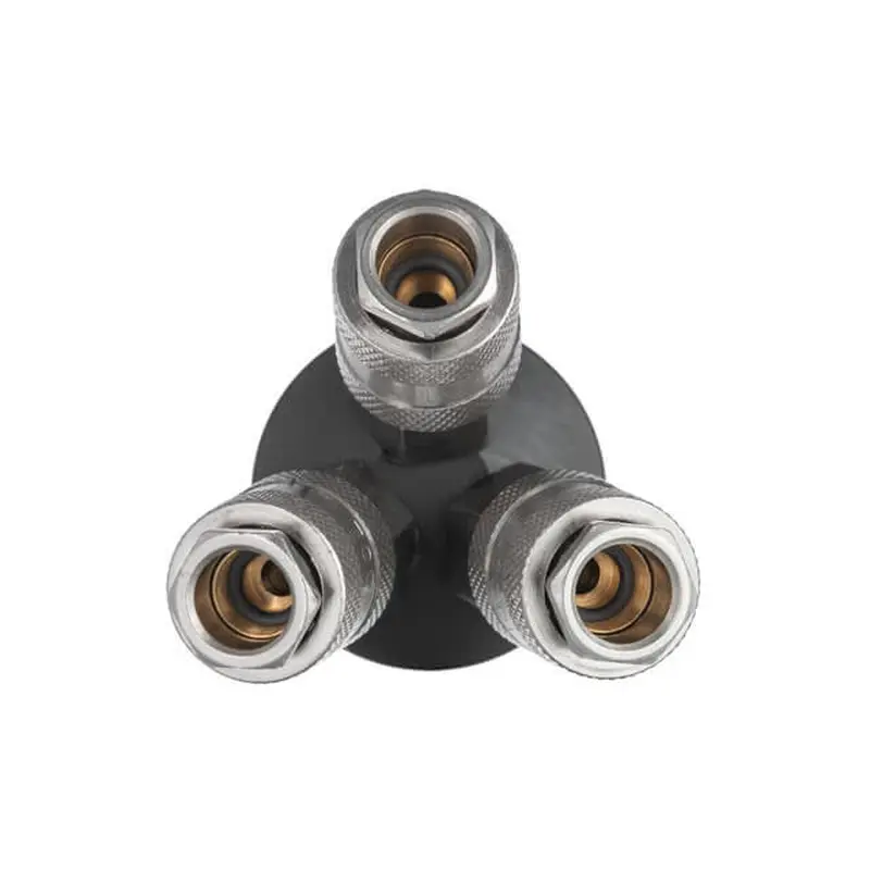 W-подібний розгалужувач повітря дозволяє одночасно під'єднати 3-х користувачів повітря і побудувати потужну пневматичну систему з тиском до 10 бар. На вході повітря встановлена різьба 1/4", а на виходах - надійні універсальні швидкороз'ємні з'єднання, які дозволяють легко підключити шланги високого тиску з пневмоінструментом.