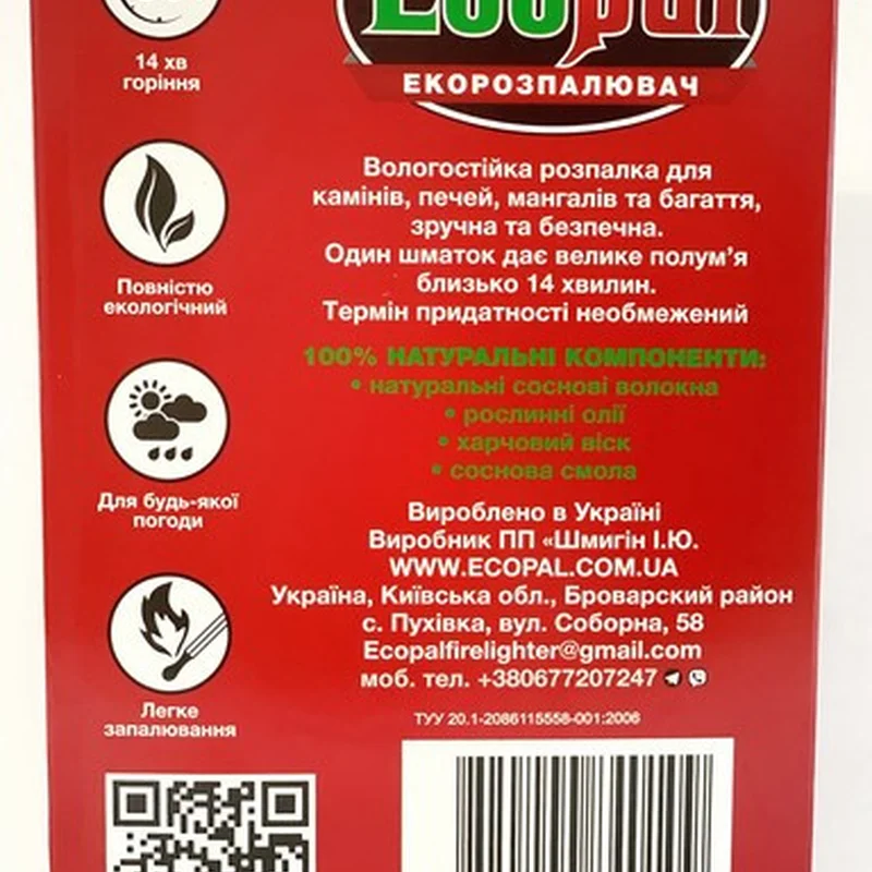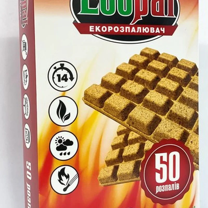 Вологостійкий розпалювач Екопал для багать, грилів, мангалів, камінів, печей. Незамінний у поході та на пікніку. В одній плитці розміром 12х19х2 см вагою 410 г міститься 50 шматочків екологічного палива. Розпалювач Time Eco виготовлений із натуральних і рослинних екологічно чистих матеріалів. Під час горіння не виділяє токсичні речовини. Має приємний природний запах. Для розпалювання в середньому необхідно 1-2 шматочки. Один шматочок дає велике полум'я близько 14 хв. Однієї плитки вистачає на 10-20 розпалювань. Забезпечує приблизно 5 годин безперервного горіння у разі послідовного підпалювання окремо кожного брикету. В упаковці 2 плитки. |