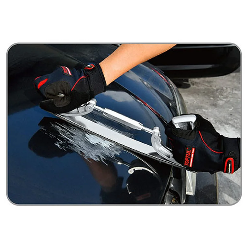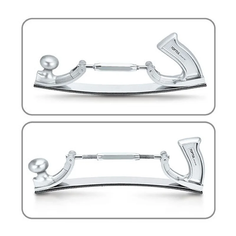 Рубанок кузовщика з регулюванням радіуса кривизни TOPTUL JGAE0205 використовується для зачищення поверхні кузова автомобіля або будь-якої іншої великої поверхні. Інструмент виготовлений з алюмінієвого сплаву і оснащений двома рукоятками. Завдяки можливості регулювання радіусу згину полотна рубанок можна використовувати на складних вигнутих поверхнях.
